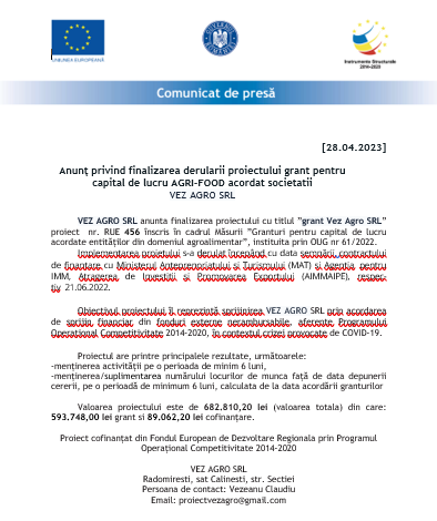Anunt privind finalizarea derularii proiectului grant pentru capital de lucru AGRI-FOOD acordat societatii VEZ AGRO SRL