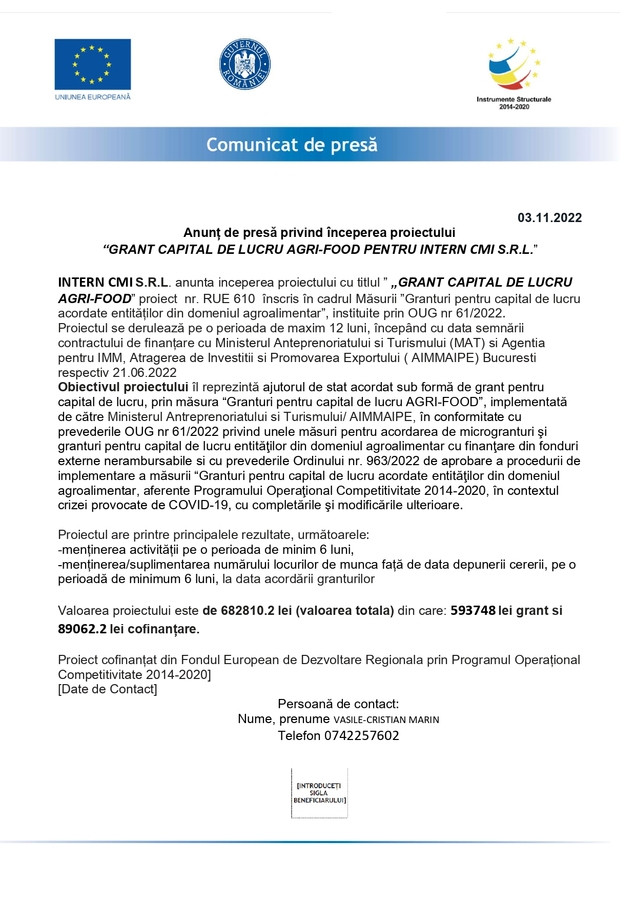 Intern CMI S.R.L. anunta inceperea proiectului cu titlul Grant capital de lucru Agri-Food, proiect nr. RUE 610 inscris in cadrul Masurii Granturi pentru capital de lucru acordate entitatilor din domeniul agroalimentar, instituite prin OUG nr 61/2022.