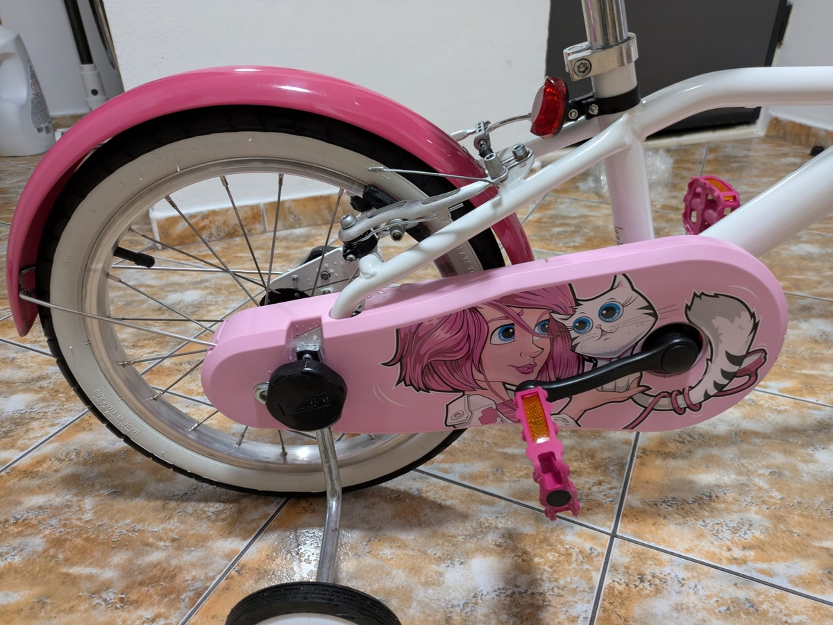 Bicicleta fete 5-10 ani, 16 inch, cumparata din Dechatlon, are roti ajutatoare si cos, stare foarte buna.