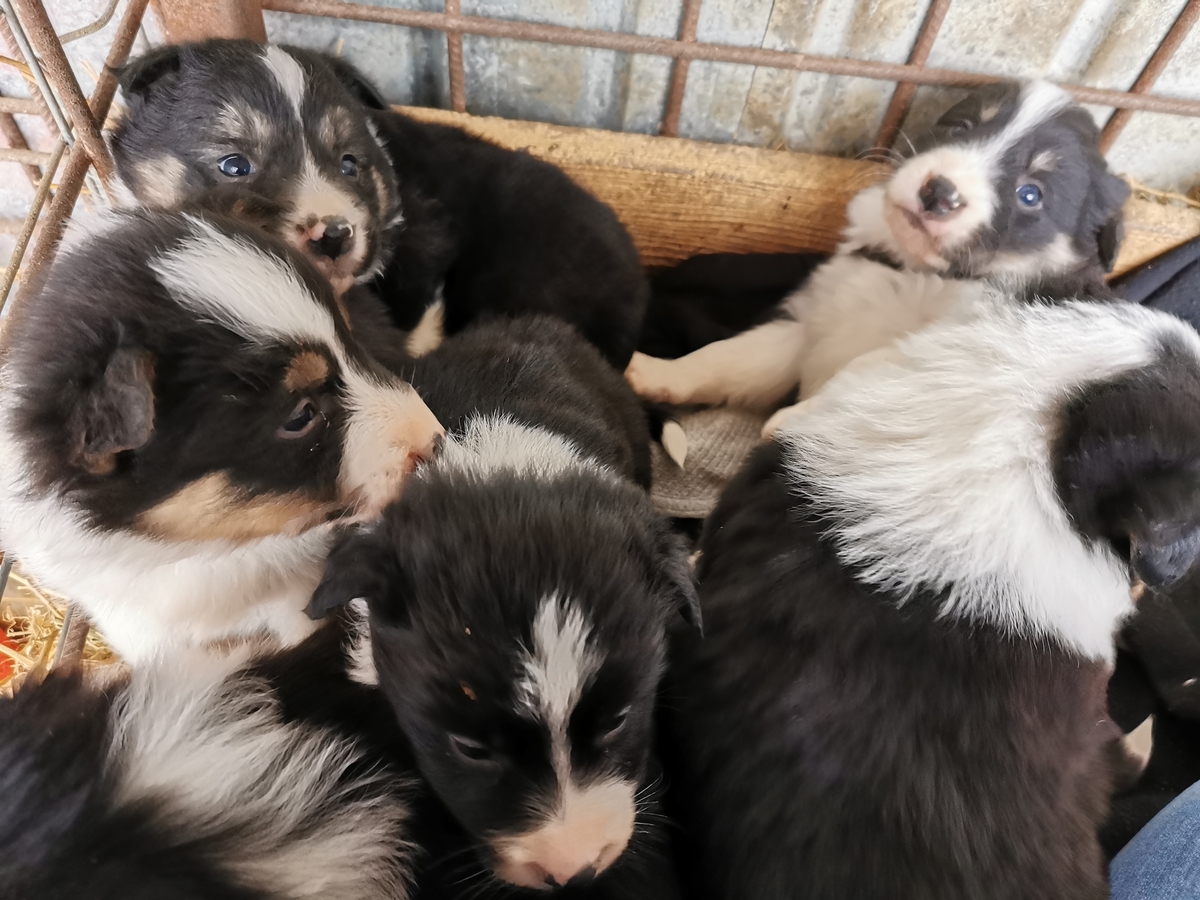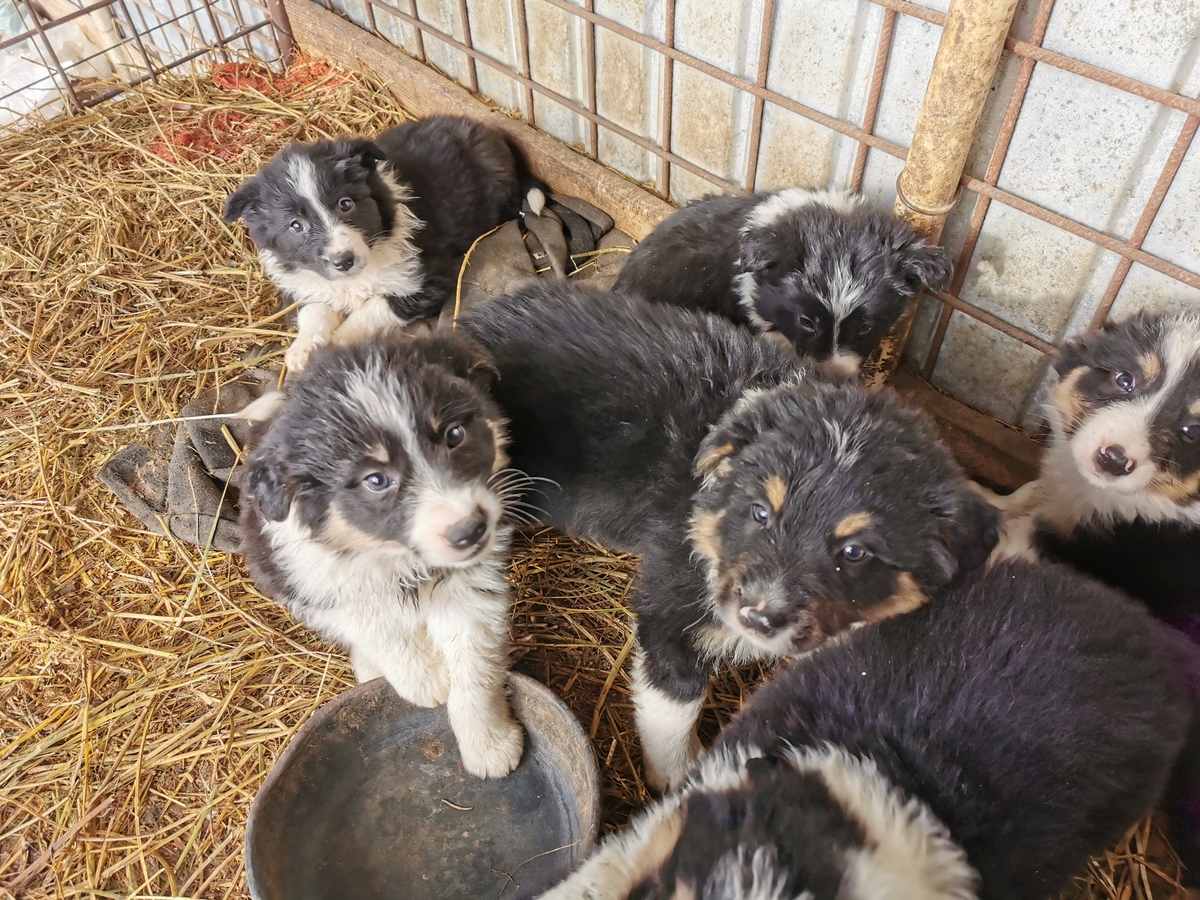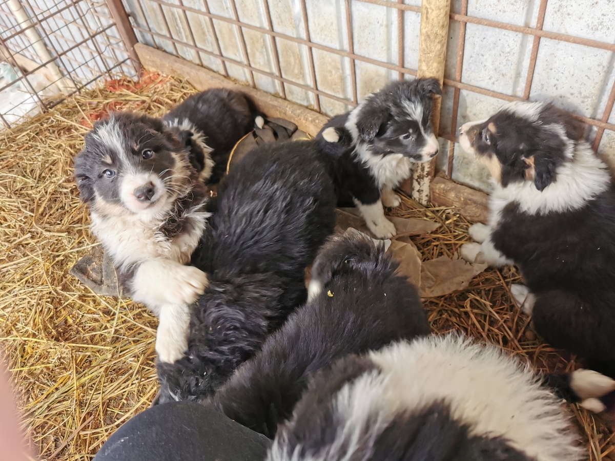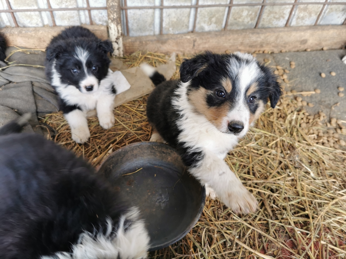 Vand catelusi rasa border collie. Varsta de 2 luni, 3 fetite si 4 baietei, avand variante de colorit blana alb cu negru ori alb negru si maro.