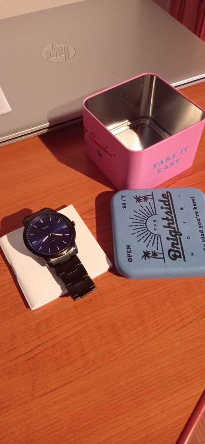 Are cutie, garantie, nepurtat, culoare neagra, cadran albastru