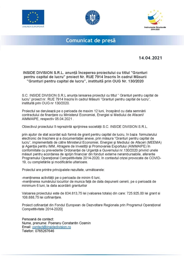 Inside Division S.R.L. anunta inceperea proiectului cu titlul ”Granturi pentru capital de lucru” proiect Nr. RUE 7914 inscris in cadrul Masurii ”Granturi pentru capital de lucru”, instituita prin OUG Nr. 130/2020.