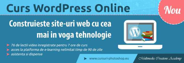 promo (-20%) - invata sa creezi site-uri web complete in mod rapid si intuitiv cu cea mai utilizata tehnologie la nivel mondial - WordPress. Cursul Online WordPress este format din 76 de lectii video