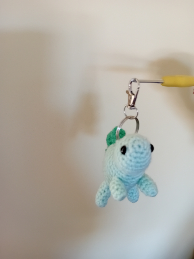 Breloc crosetat reprezentand un dinozaur, ce poate fi atasat la diferite obiecte: geanta, poseta, rucsac, ghiozdan etc.