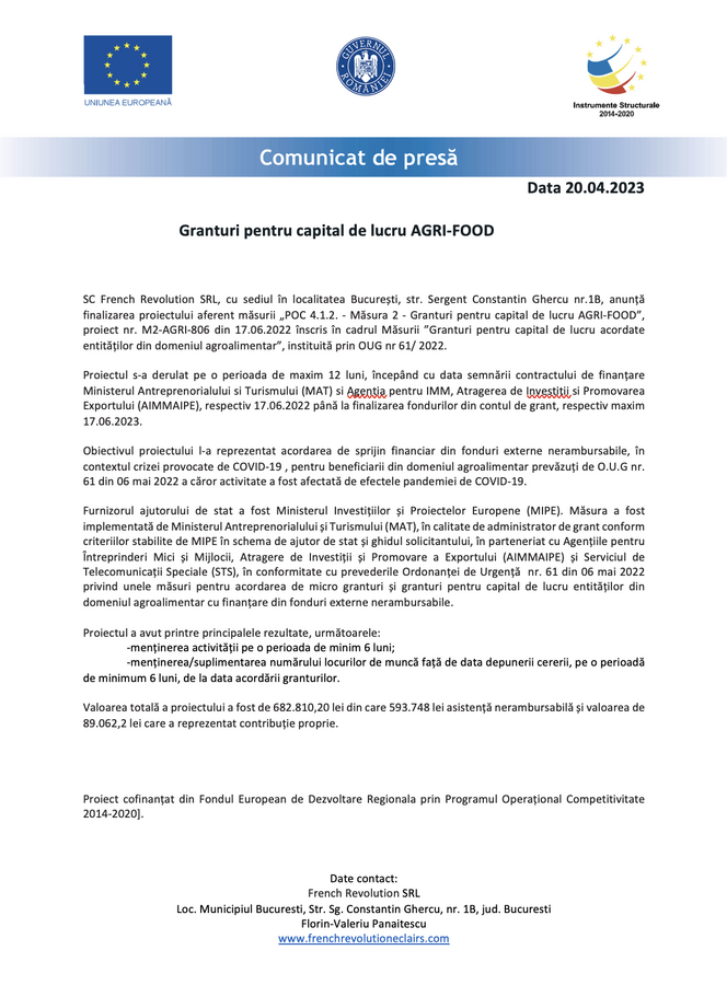 Granturi pentru capital de lucru Agri-Food. SC French Revolution SRL, cu sediul in localitatea Bucuresti, str. Sergent Constantin Ghercu nr. 1B, anunta finalizarea proiectului aferent masurii POC 4.1.2. - Masura 2 - Granturi pentru capital de lucru Agri-Food, proiect nr. M2-AGRI-806 din 17.06.2022 inscris in cadrul Masurii Granturi pentru capital de lucru acordate entitatilor din domeniul agroalimentar, instituita prin OUG nr 61/ 2022. Proiectul s-a derulat pe o perioada de maxim 12 luni, incepand cu data semnarii contractului de finantare Ministerul Antreprenorialului si Turismului (MAT) si Agentia pentru IMM, Atragerea de Investitii si Promovarea Exportului (AIMMAIPE), respectiv 17.06.2022 pana la finalizarea fondurilor din contul de grant, respectiv maxim 17.06.2023.