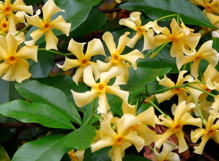Iasomia galbena (Trachelospermum jasminoides Star of Toscane , infloreste de la inceputul verii pana la inceputul toamnei, superba inflorescenta aurie parfumata contrastand cu verdele inchis al frunzelor sale.