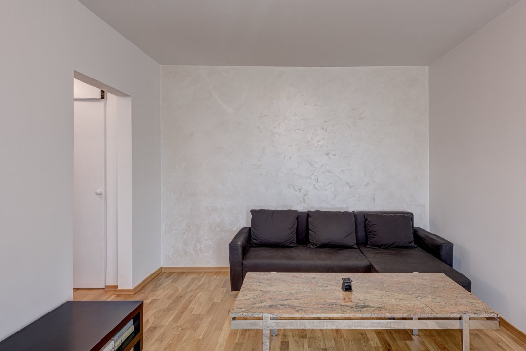 Livingul este amenajat modern, stil minimalist si este dotat cu o canapea extensibila (Ikea), masuta de cafea si mobilier pentru suport Tv si biblioteca. La cerere, se poate cumpara TV. Dormitorul este mobilat cu pat matrimonial, noptiere si comoda. Holul alaturat dormitorului beneficiaza de un spatiu de depozitare amenajat pentru haine. In cazul in care spatiul pentru haine nu este suficient, se poate achizitiona un dulap suplimentar.