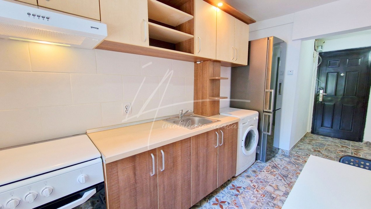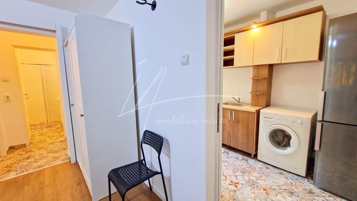 Bucataria, orientata spre est, este complet mobilata si utilata, cu masina de spalat rufe (marca Arctic), aragaz-Arctic + hota-Gorenje, ambele nou, noute, respectiv combina frigorifica (marca Samsung), de foarte buna calitate. Mobilierul suspendat beneficiaza si de spoturi, conferind o luminozitate suplimentara. O masa si scaunele completeaza spatiul suficient servirii mesei.