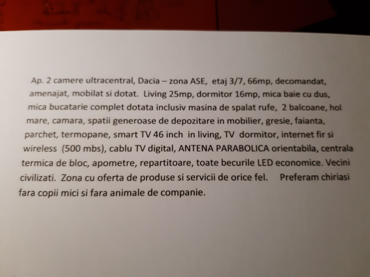 proprietar colaborez cu imobiliare. Apartament 2 camere ultracentral, Dacia, zona ASE, 1948, amenajat, mobilat si dotat. Living 25 mp, dormitor 16 p, mica baie cu dus, mica bucatarie complet dotata, 2 balcoane, hol mare, camara, gresie, parchet, termopan, aer conditionat, internet fir si router wi-fi, cablu tv, antena parabolica, apometre, repartitoare, tv 46 inchi, tv 40 inchi. Fara copii mici, fara animale de companie. Pret neg.