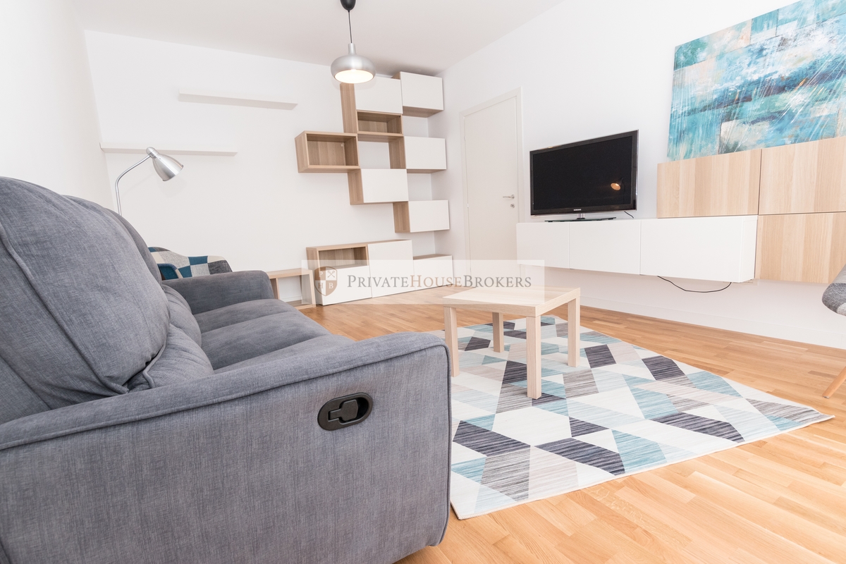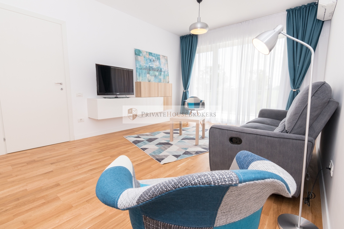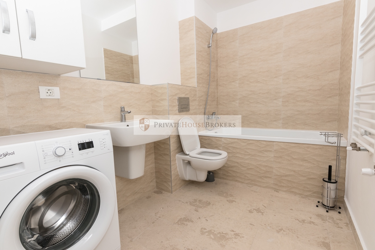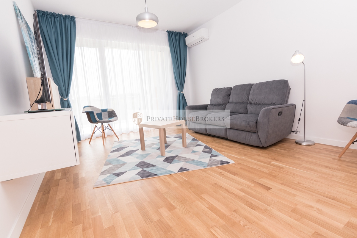 Apartamentul este situat la etajul 3 din 4, living si dormitor matrimonial, baie cu cada, este decomandat si are o suprafata de 50 mp utili interior + 2 balcoane de 10 mp si 5 mp. Apartamentul este mobilat si utilat complet modern, totul este nou la prima inchiriere, dispune de centrala proprie de apartament, aer conditionat, televizor, masina de spalat vase si rufe, incalzire in pardoseala, loc de parcare subteran, paza.