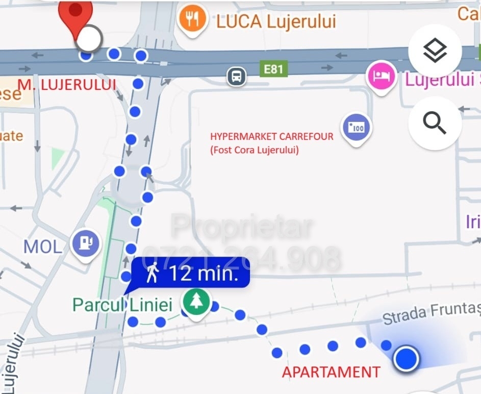 Proprietar, ofer spre inchiriere apartament de 2 camere, complet decomandat, in complexul Plaza Residence (Faza 1, Bloc 1 – construit in 2019), la 300 m de statia M. Lujerului, primul bloc de la Parcul Liniei. Liber,