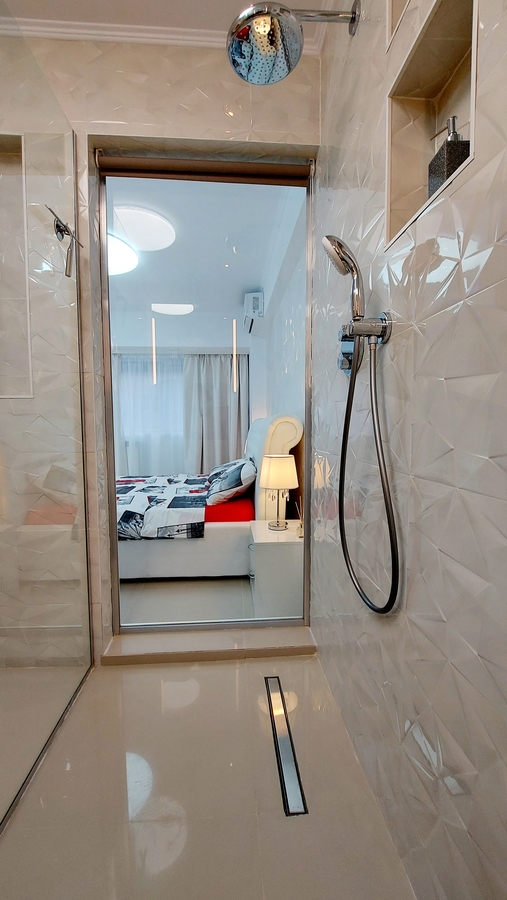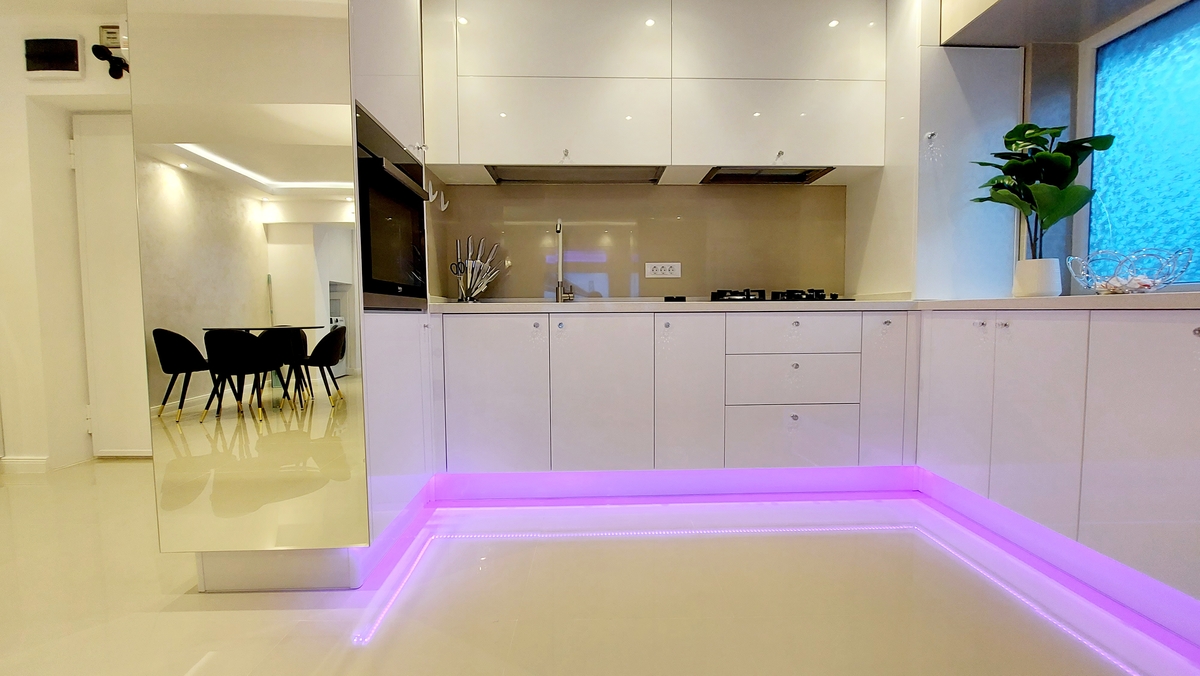 * Lumini led cu telecomanda amplasate pe zonele de bucatarie, living, baie si dormitor cu setare culori.