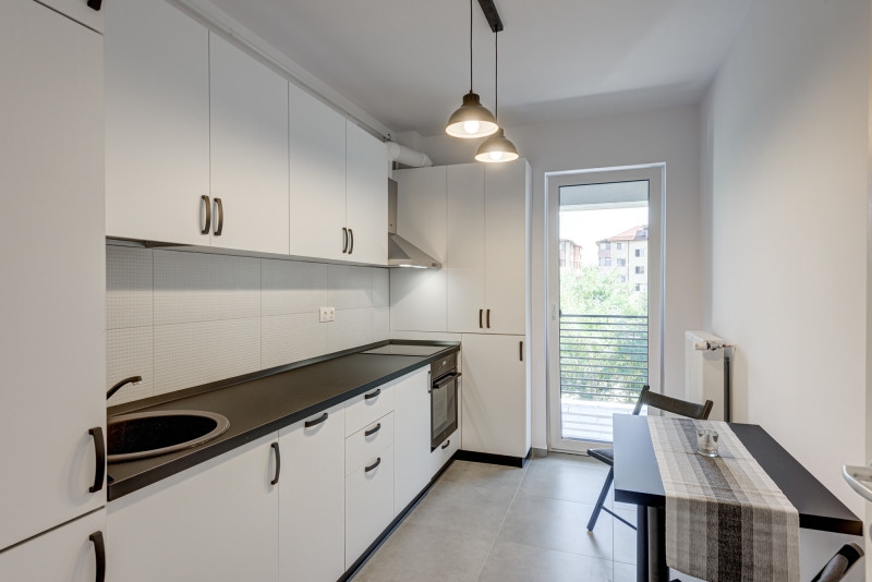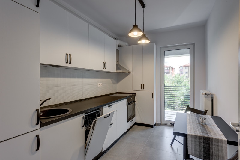 Bucataria este complet mobilata si echipata cu electrocasnice incorporate: plita cu inductie si cuptor electric gama Electrolux, hota Franke, masina de spalat vase si frigider incorporat marca Electrolux, toate noi si in garantie. Mobilierul este realizat pe comanda si este foarte bine structurat astfel incat sa asigure spatii necesare pentru depozitare. Tot in bucatarie este amenajat si locul de luat masa.