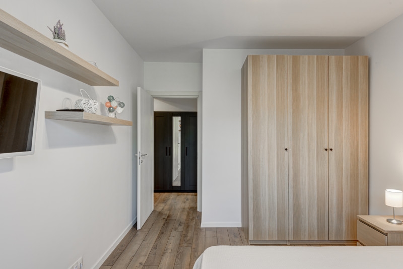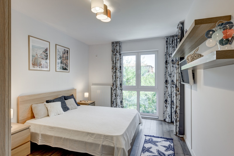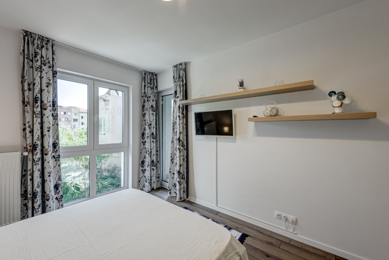 Dormitorul beneficiaza de ferestre generoase si este complet amenajat cu pat matrimonial cu saltea noua, 2 noptiere, dressing si TV. Baia este amenajata modern, echipata cu obiecte sanitare noi si masina de spalat rufe Electrolux. Tot mobilierul din living si dormitor este marca Ikea. Holul este amenajat cu un dulap pentru haine si pantofar.