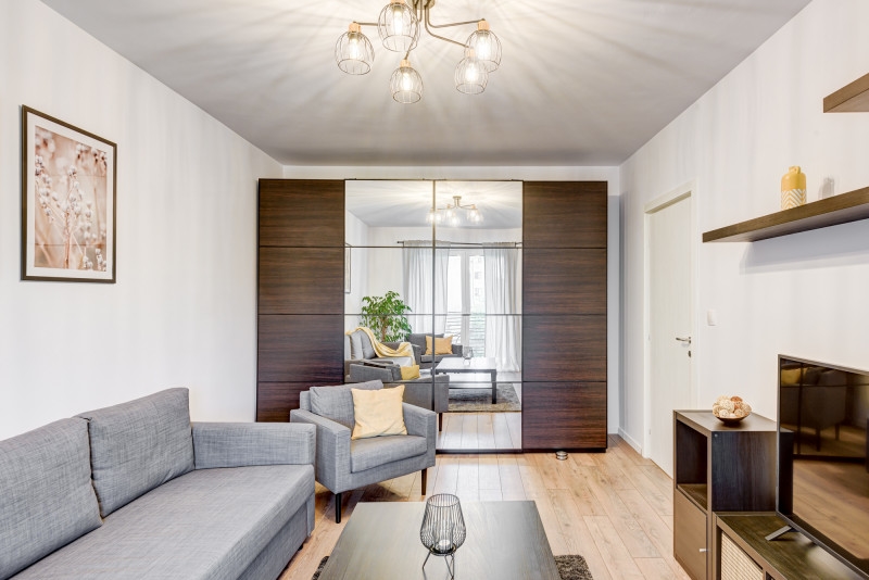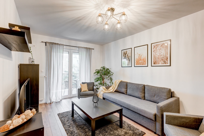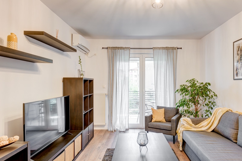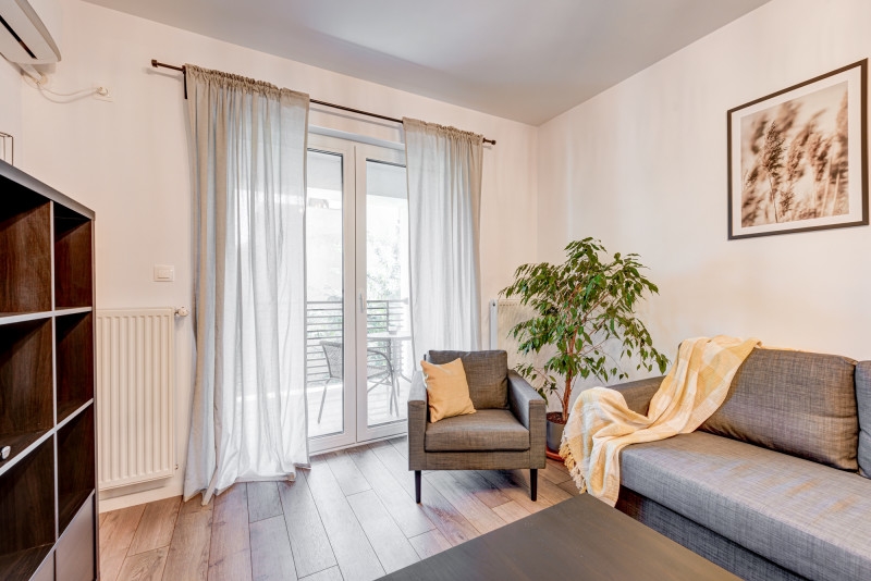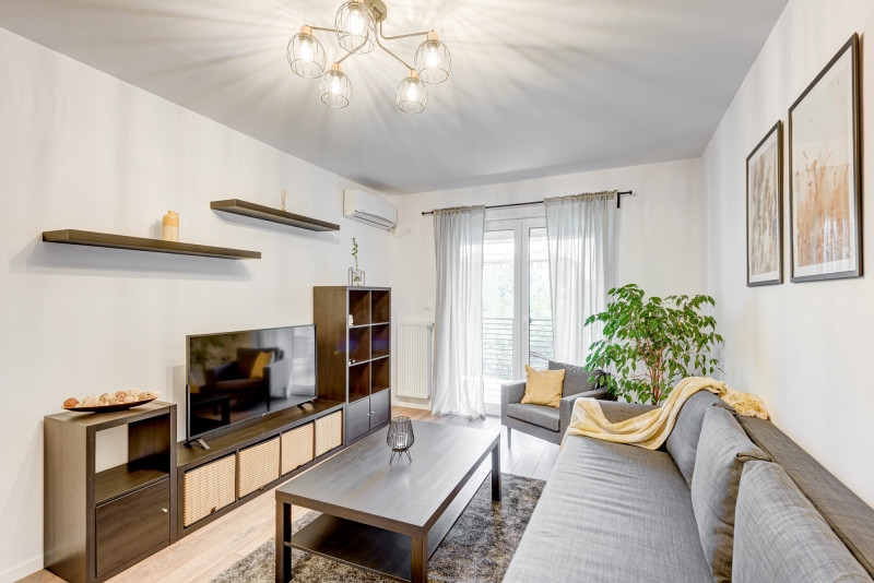 Livingul este foarte luminos, beneficiaza de ferestre panoramice si acces catre terasa. Este amenajat in stil minimalist cu mobilier Ikea si este dotat cu canapea extensibila, doua fotolii, dressing, biblioteca, masuta pentru cafea, TV nou si un aparat de aer conditionat.