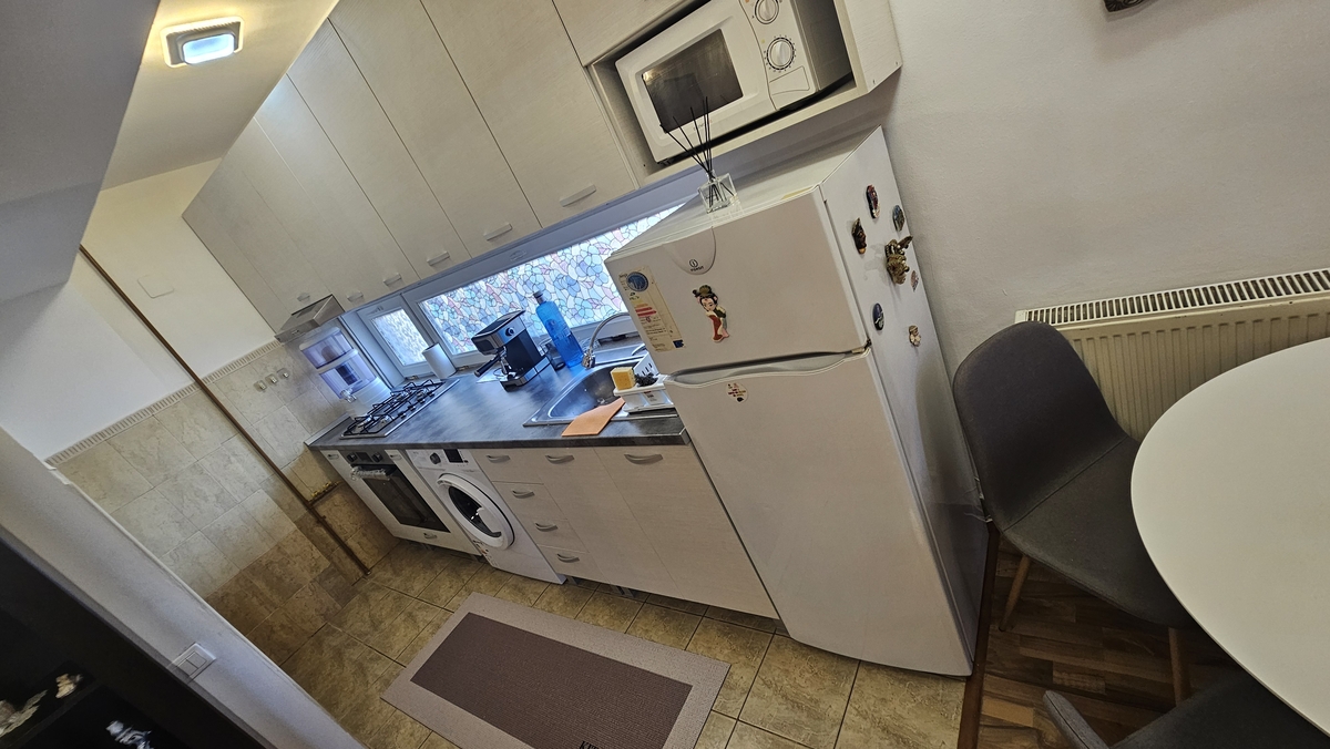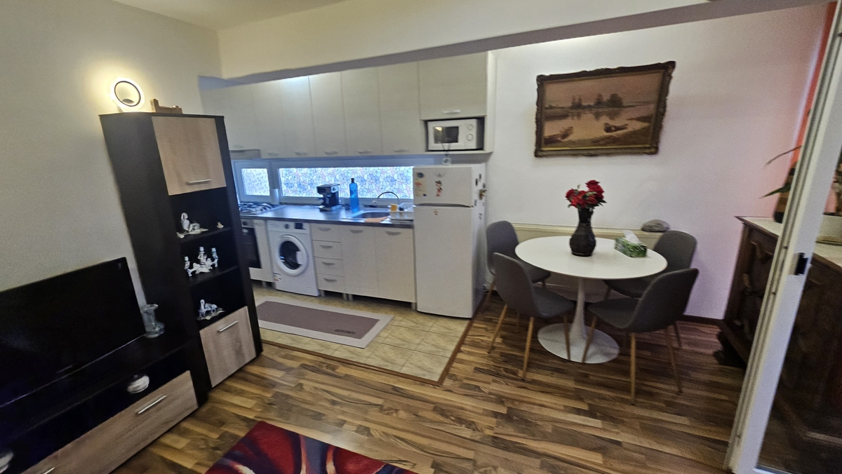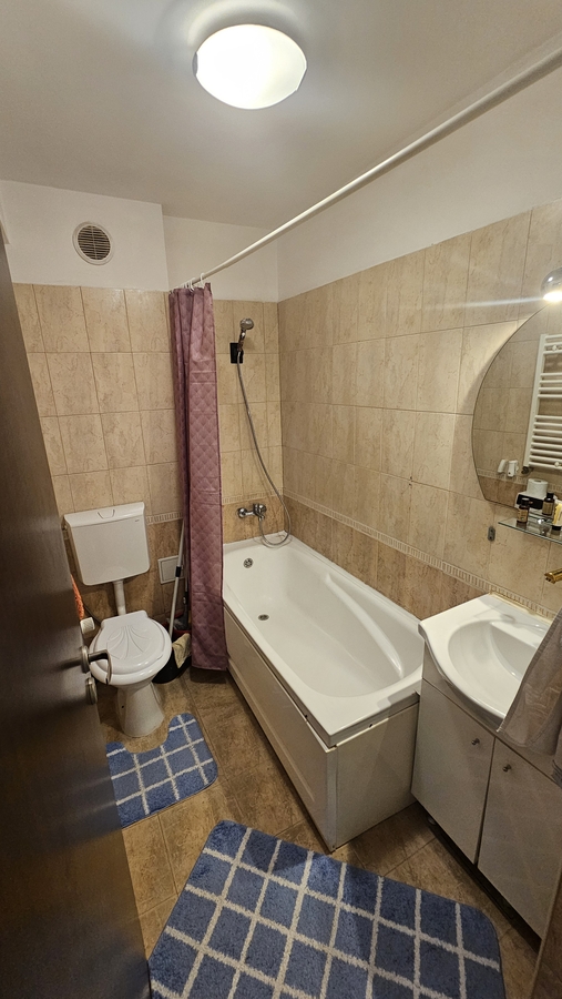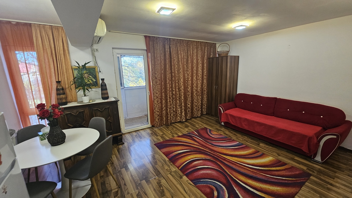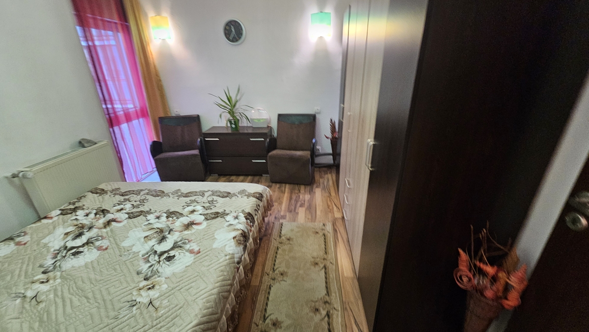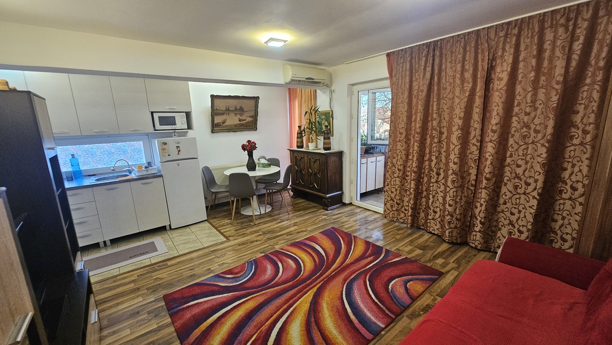 Proprietari fiind pornim la o noua provocare si ne dorim un prieten cu suflet mare si dornic de un camin cald si primitor situat intr-o zona plina de liniste si de verdeata. Este vorba de un apartament cochet amplasat la et 1 al unui imobil S+P+2+M, din anul 2008, complet mobilat si utilat, masina de spalat, AC, balc inchis si bucatarie complet noua atat ca mobila cat si ca aparatura.