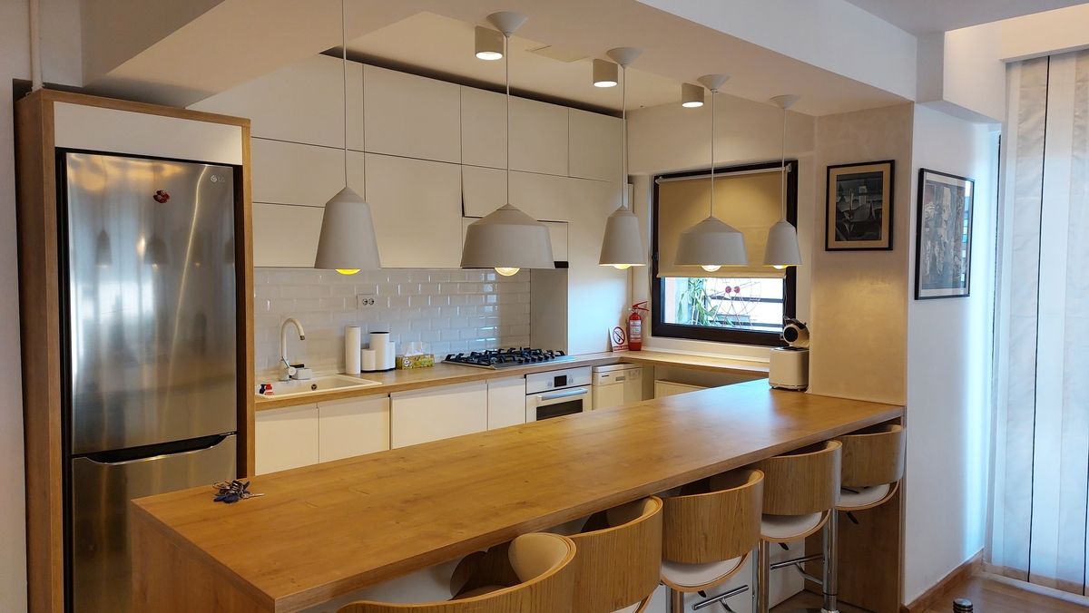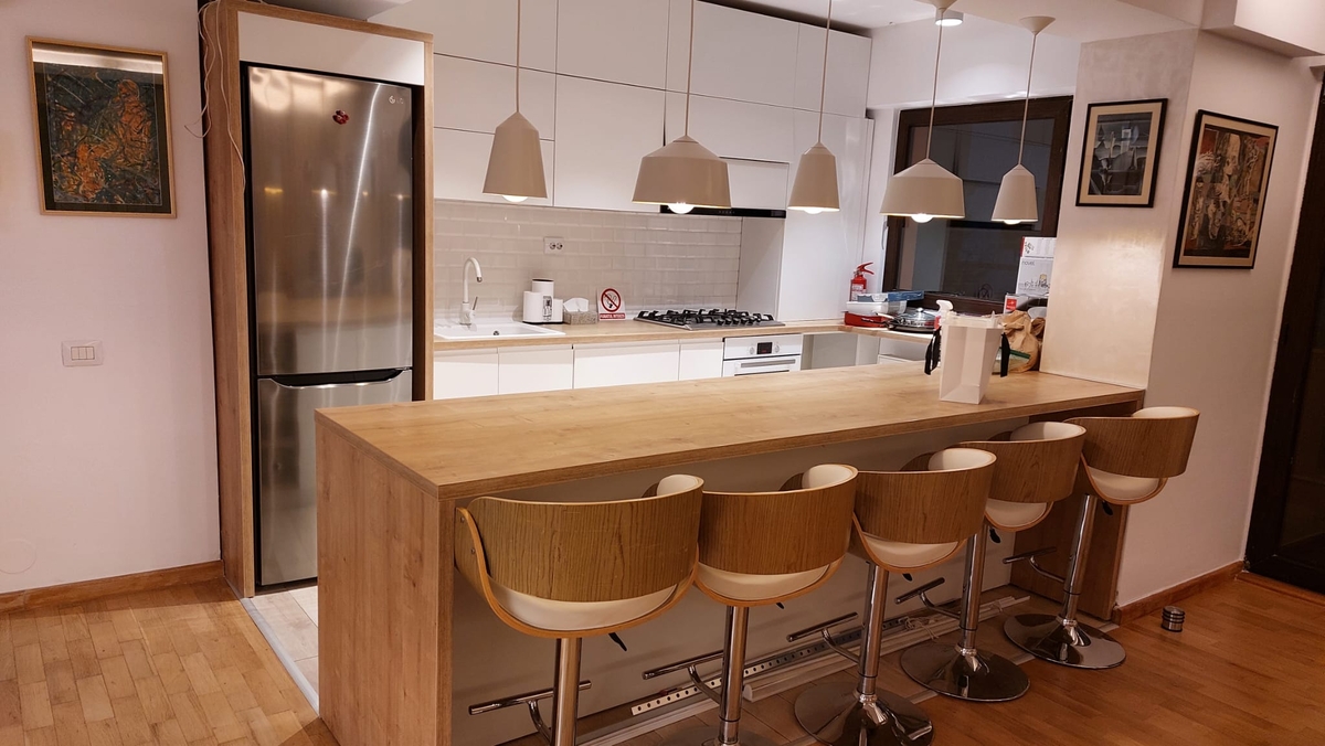 linie dulapuri (culoare -alb, 970 cm), blat compozit pentru mobilier (culoare -lemn natur), scaune tip bar, cu picioare din inox; -hota evacuare Pyrmais; plita gaz Bosh; cuptor electric Bosh; masina de spalat rufe Beko; masina de spalat vase Heinner; cuptor cu microunde Gorenje; multicooker Bosch 48 programe; prajitor de paine marca Heinner; combina frigorifica LG; cafetiera espresso pentru aragaz; cafetiera Krups; -tigaie Tefal si capac din sticla; tigaie inox si capac din sticla; tava cuptor Tefal; set tacamuri Inoxriv, inox; set farfurii Bormioli Rocco, seria Infinito; boluri sticla; accesorii depozitare din sticla; set razatoare si accesori Westmark; set de boluri Homeware; set pahare whisky; set cani; set cesti si farfurii cafea (portelan); set pahare sampanie (Schott Zwiesel -Fortissimo); set pahare vin rosu (Schott Zwiesel -Fortissimo); set pahare vin alb (Schott Zwiesel -Fortissimo); set pentru cafea si desert (Flikt Ritzenhoff & Breker/Madras); set pahare apa si vas apa Novel; set pahare de apa mari; cutii plastic; set cutite Kring; set ustensile de gatit Inoxriv, inox; set ustensile bucatarie (polonic, spumiera, tel, palete, linguri salata, linguri lemn etc); suport cutite; cutit mediu; desfacator dopuri Fackelmann; stingator incendiu;
