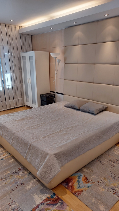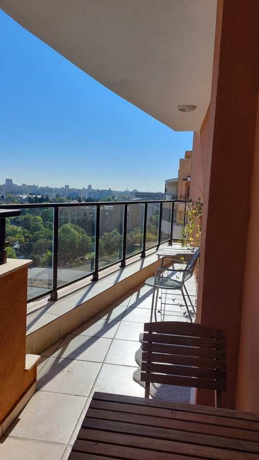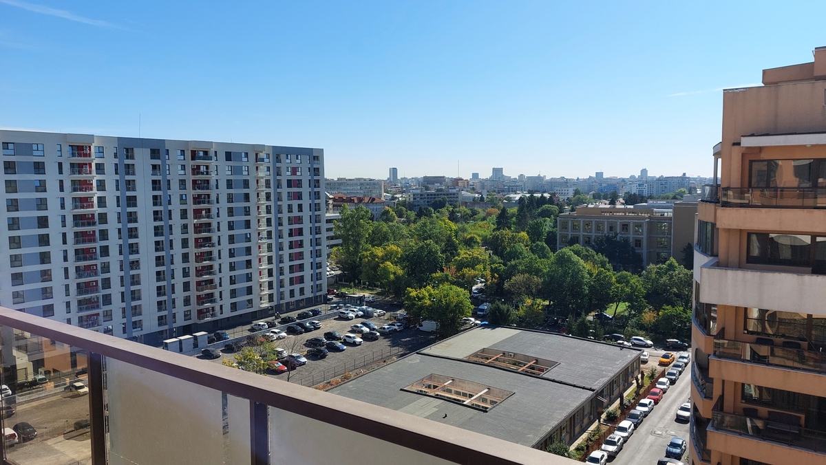 Apartament in suprafata utila de 77 m.p. si 18 m.p. balcoane, din Bucuresti, sector 6, Splaiul Independentei, compus din camera de zi (35 m.p.), dormitor (17 m.p.), bucatarie (9 m.p.), baie (5 m.p.), grup sanitar (2 m.p.), hol (9 m.p.), balcon (7 m.p.) si balcon (11 m.p.).