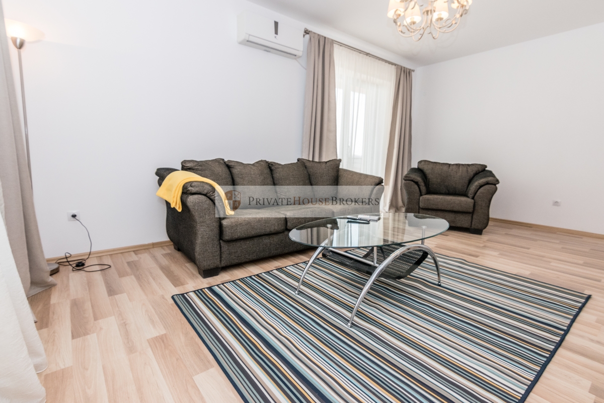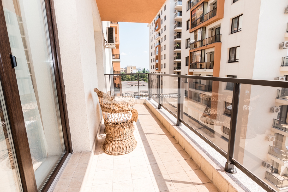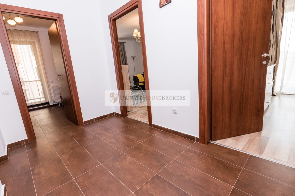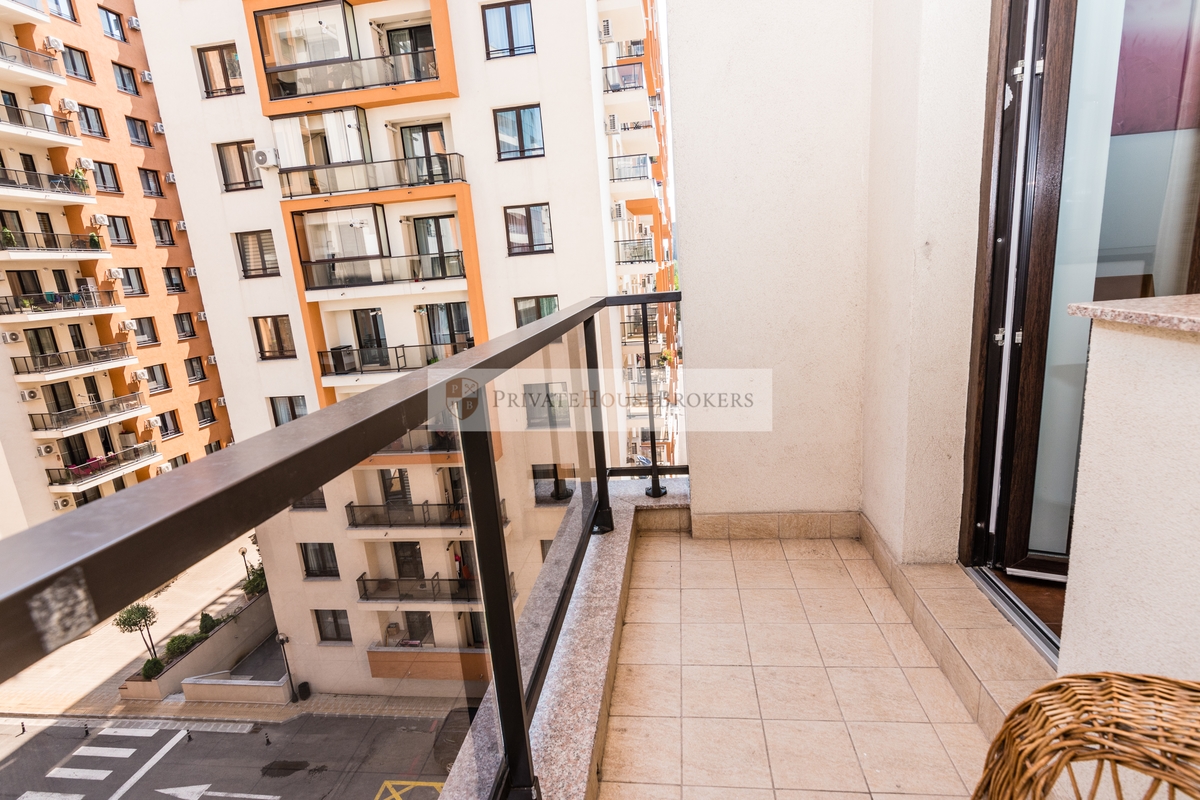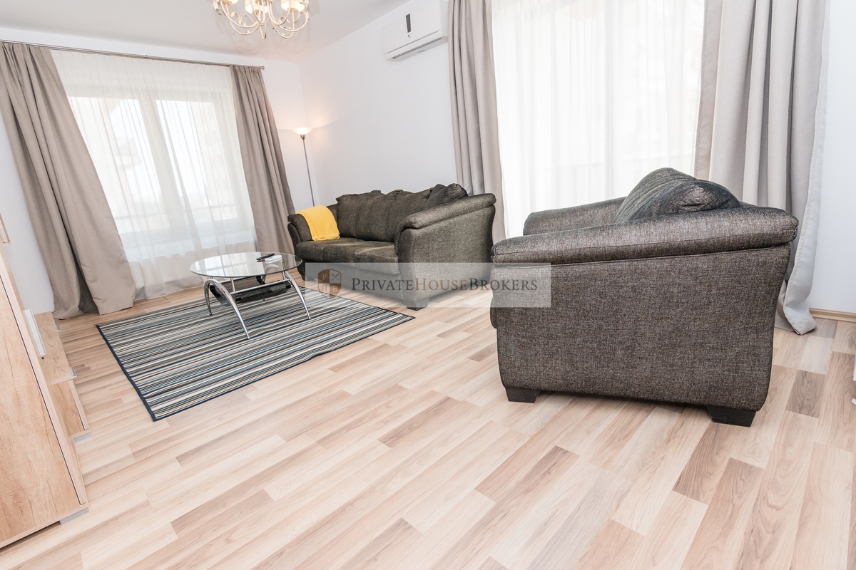 Apartamentul este situat la etajul 5 din 11, are 2 camere, living si dormitor cu pat matrimonial, baie cu cada, 2 balcoane, este decomandat si are o suprafata totala de 67 mp, respectiv 60 mp suprafata utila. Apartamentul este mobilat si utilat complet modern, dispune de centrala proprie de apartament, 2 televizoare, aer conditionat, loc de parcare suprateran. In pret este inclus si contractul inregistrat la Administratia Financiara
