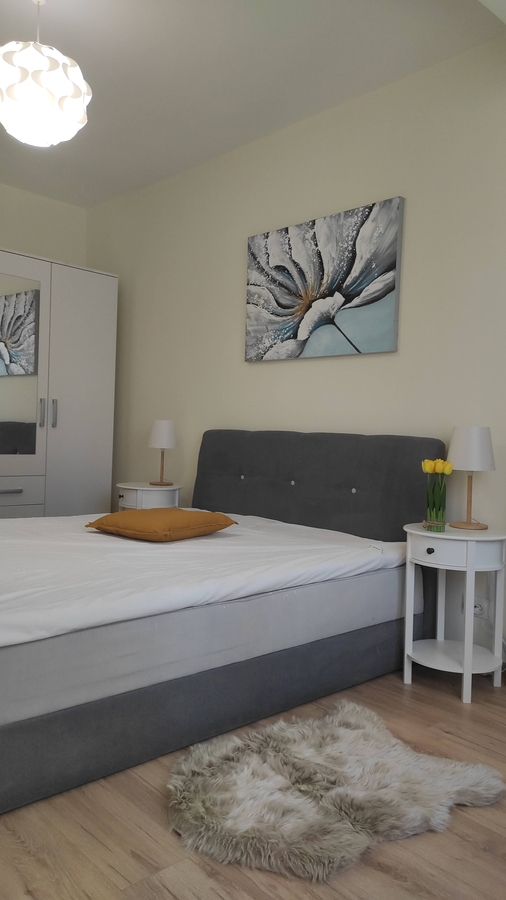 - Dormitor cu pat dublu matrimonial si dressing foarte incapator, noptiere, veioze, draperii blackout