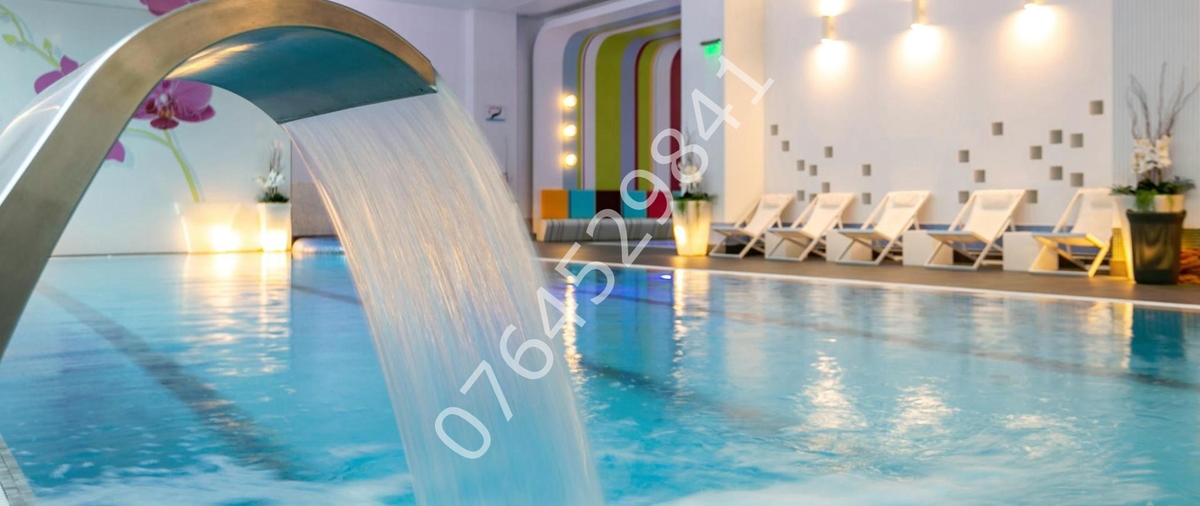 Vedere catre zona verde a complexului / intrare Orhideea Spa (centru spa, bazin inot, sala fitness etc).