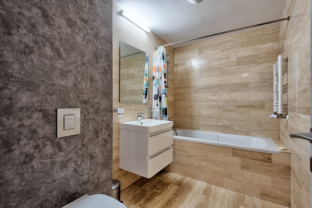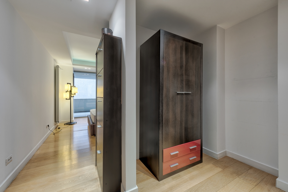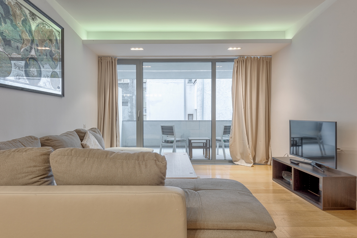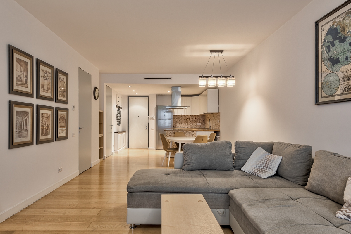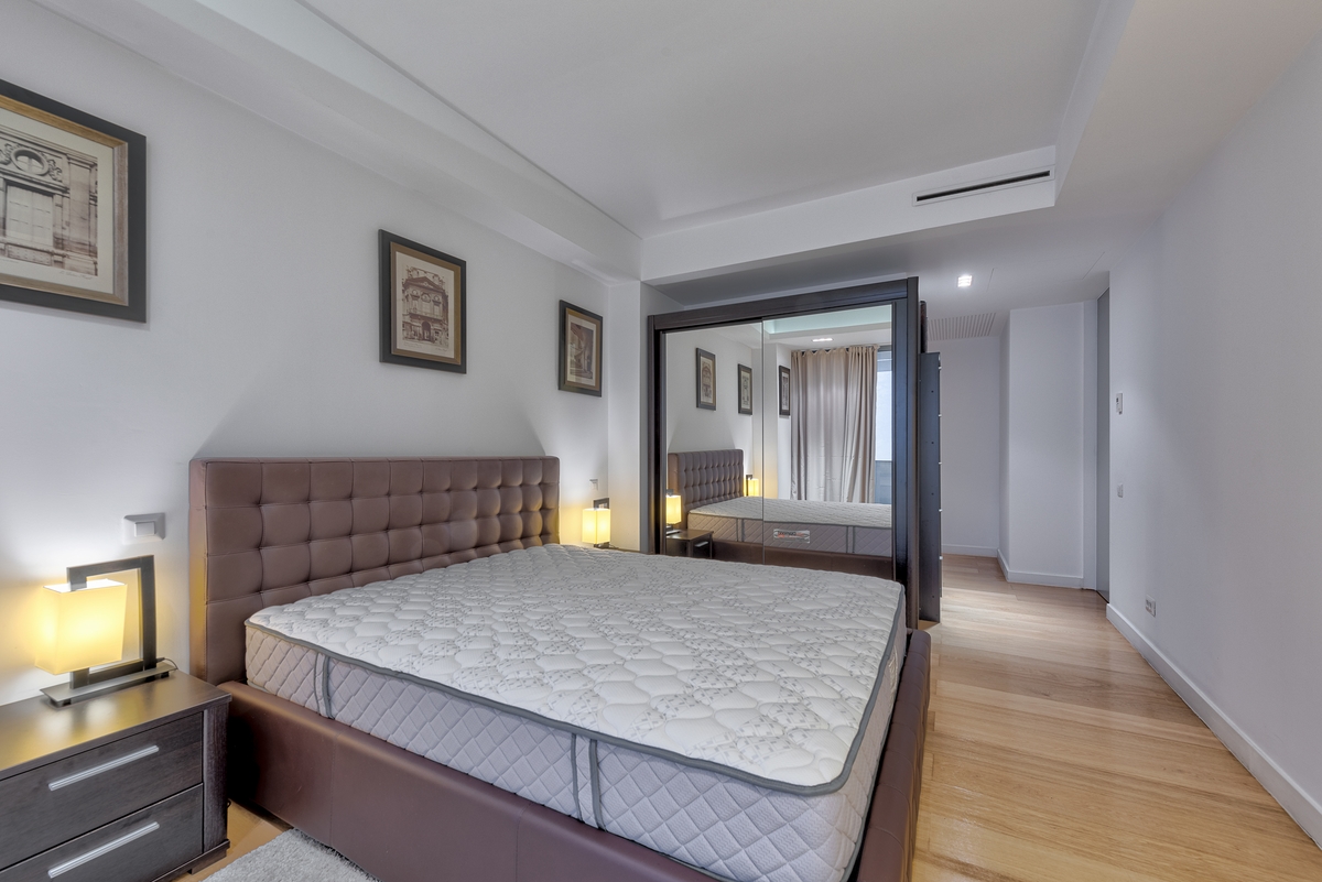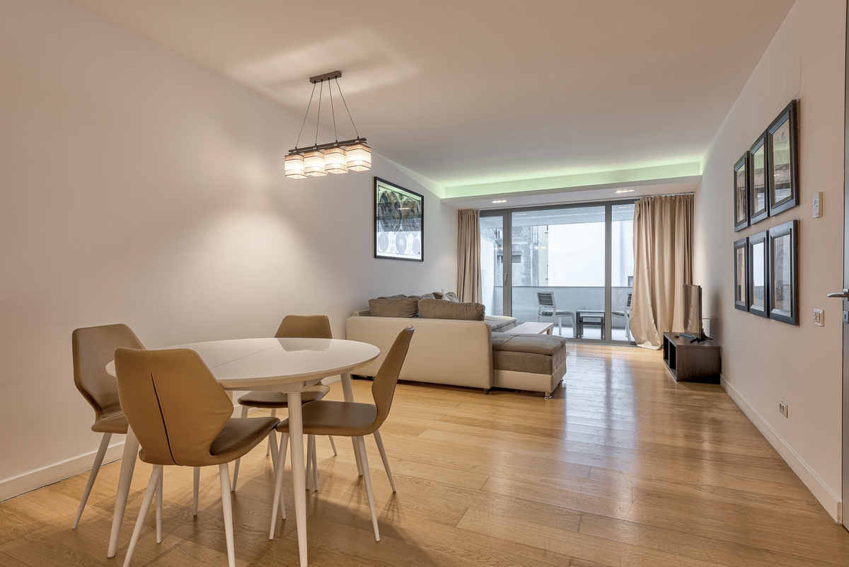 Apartamentul de 80 de mp, cu o terasa de 15 mp, dispune de dormitor matrimonial cu dressing si baie proprie, plus o toaleta de serviciu, parcare subterana si este mobilat si echipat complet.