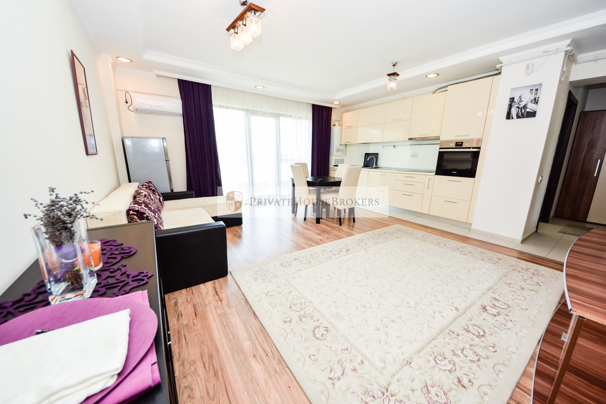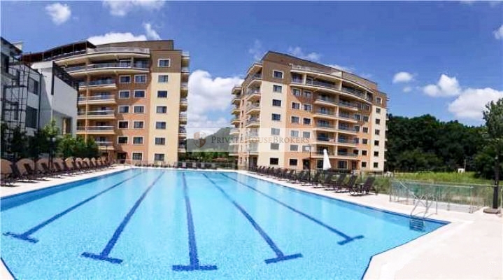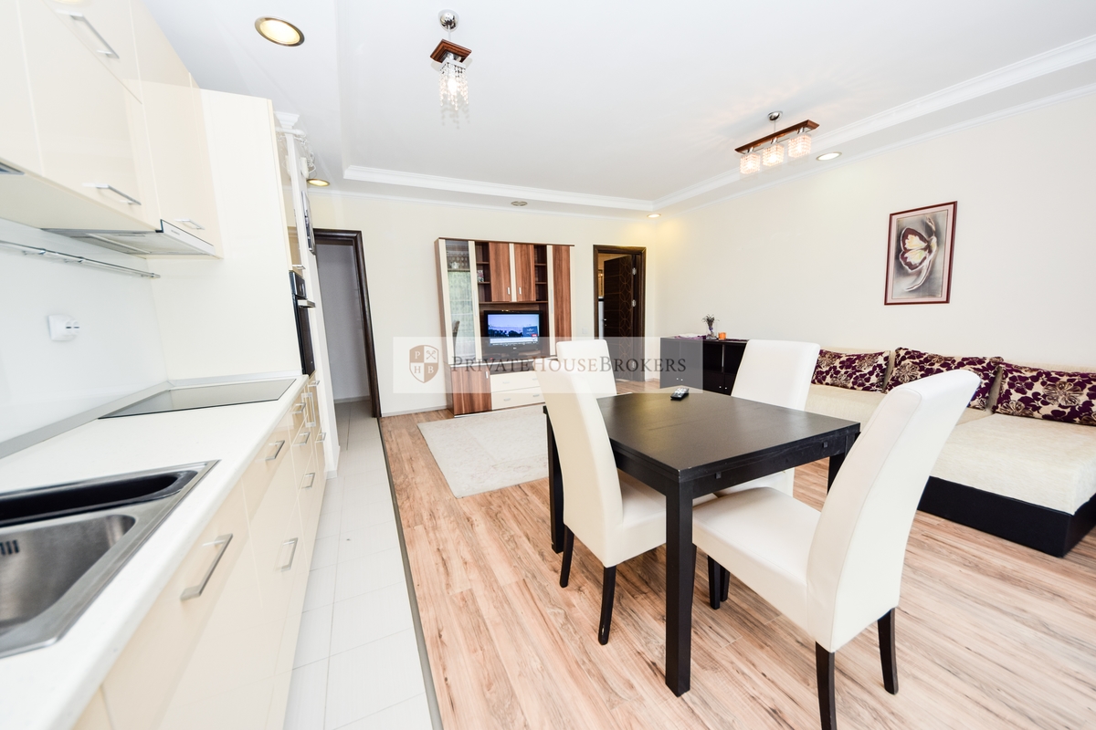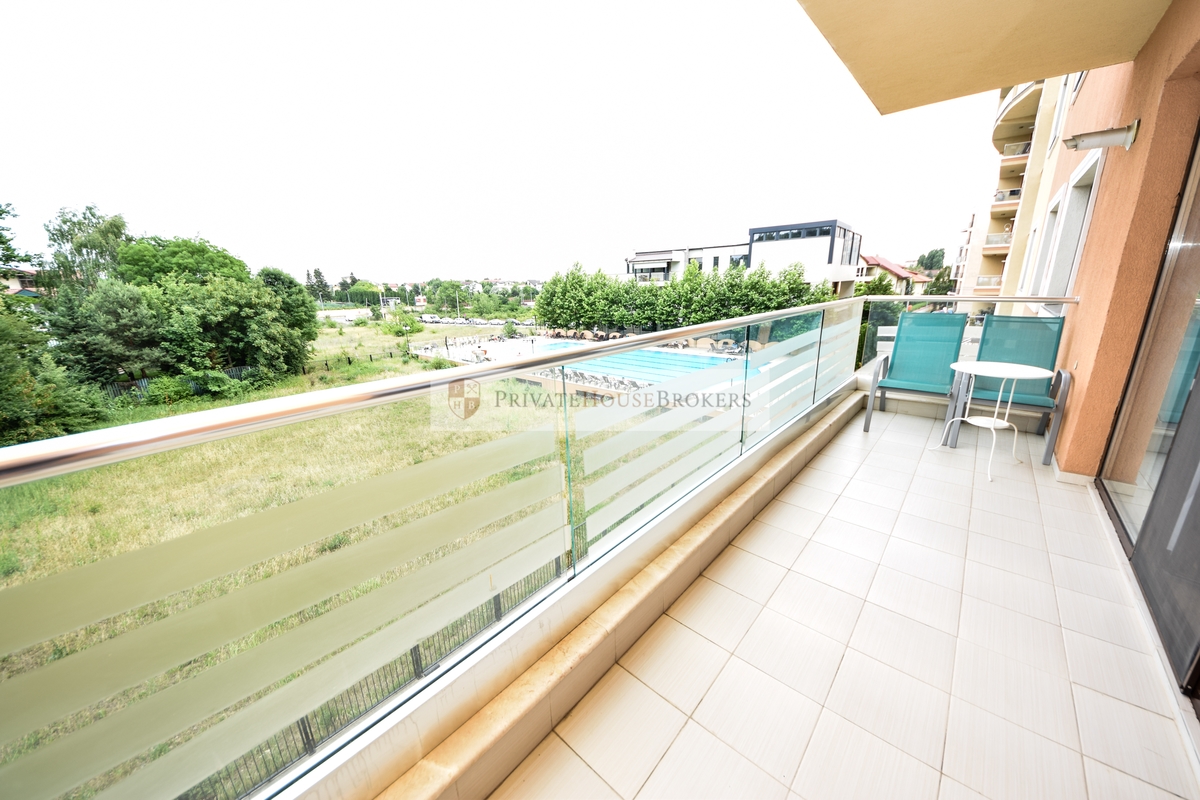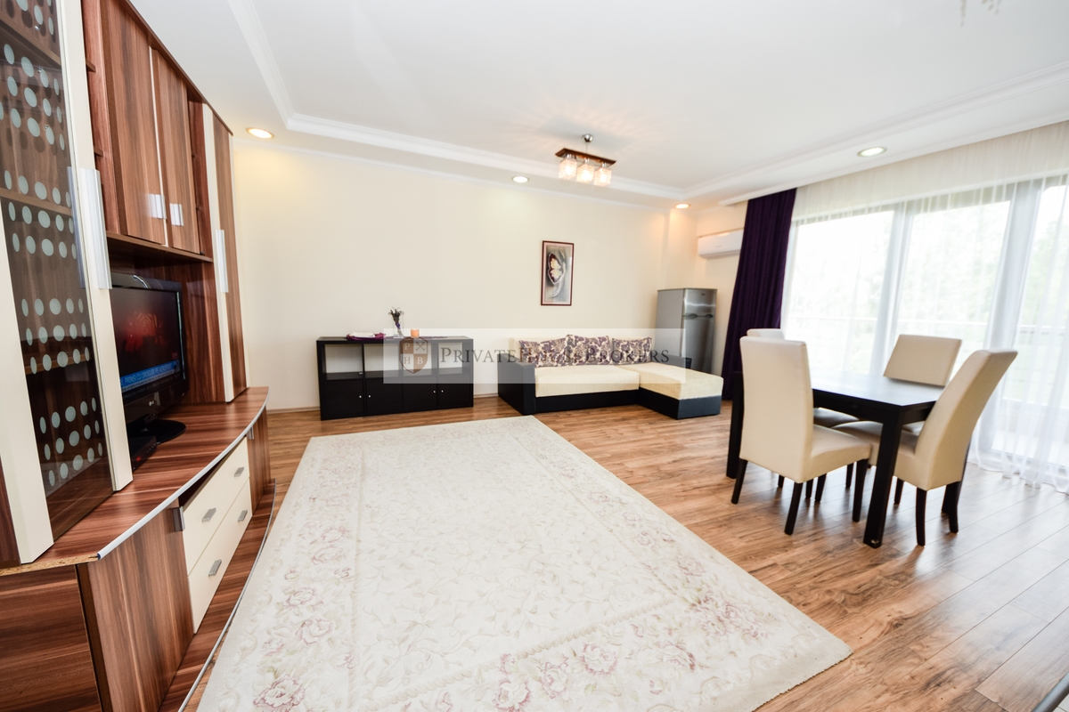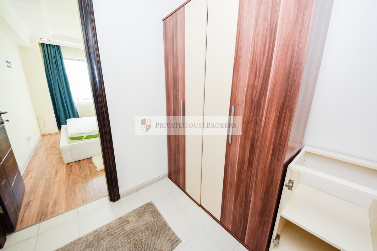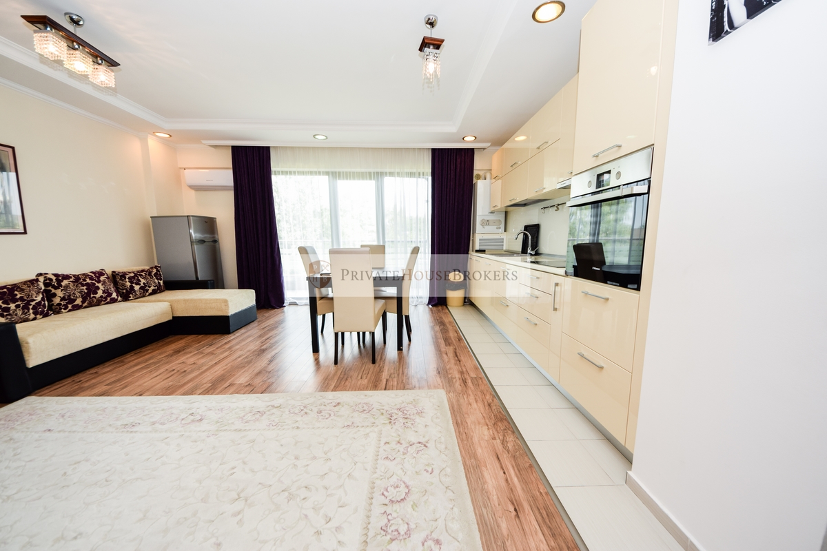 Apartamentul este situat la etajul 2 din 7, living si dormitor matrimonial, baie cu cada, terasa mare, este semidecomandat si are o suprafata de 55 mp interior + 9 mp terasa. Apartamentul este mobilat si utilat complet modern, dispune de centrala proprie de apartament, aer conditionat, televizor, paza 24/24. Acces gratiut la piscina si sauna.