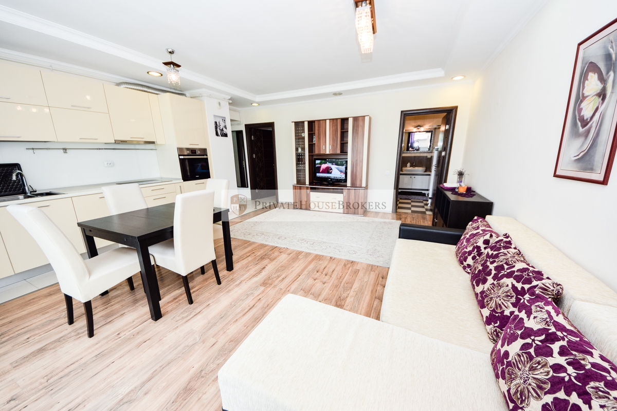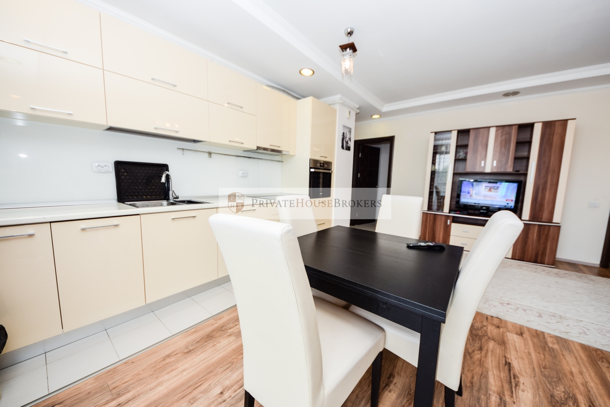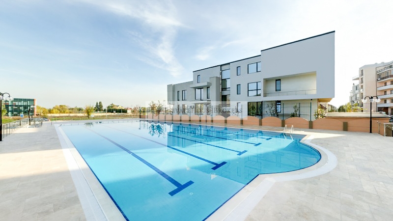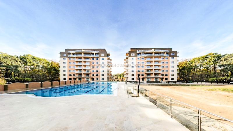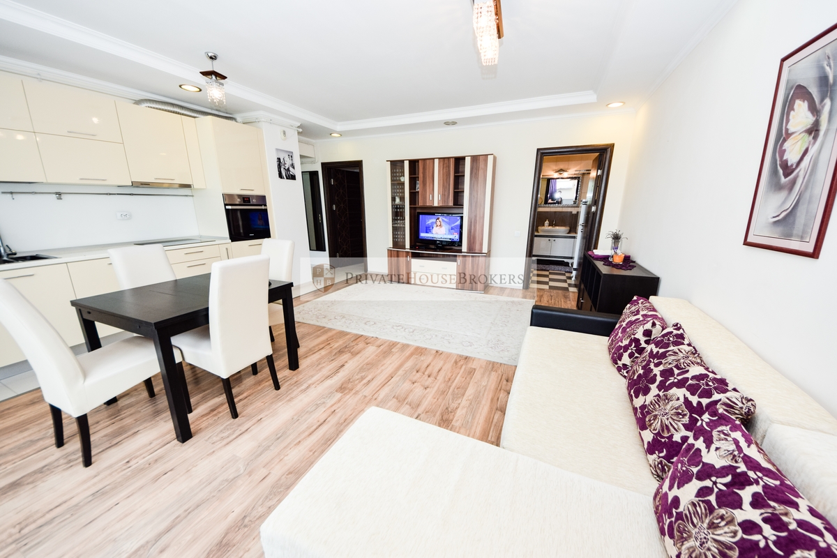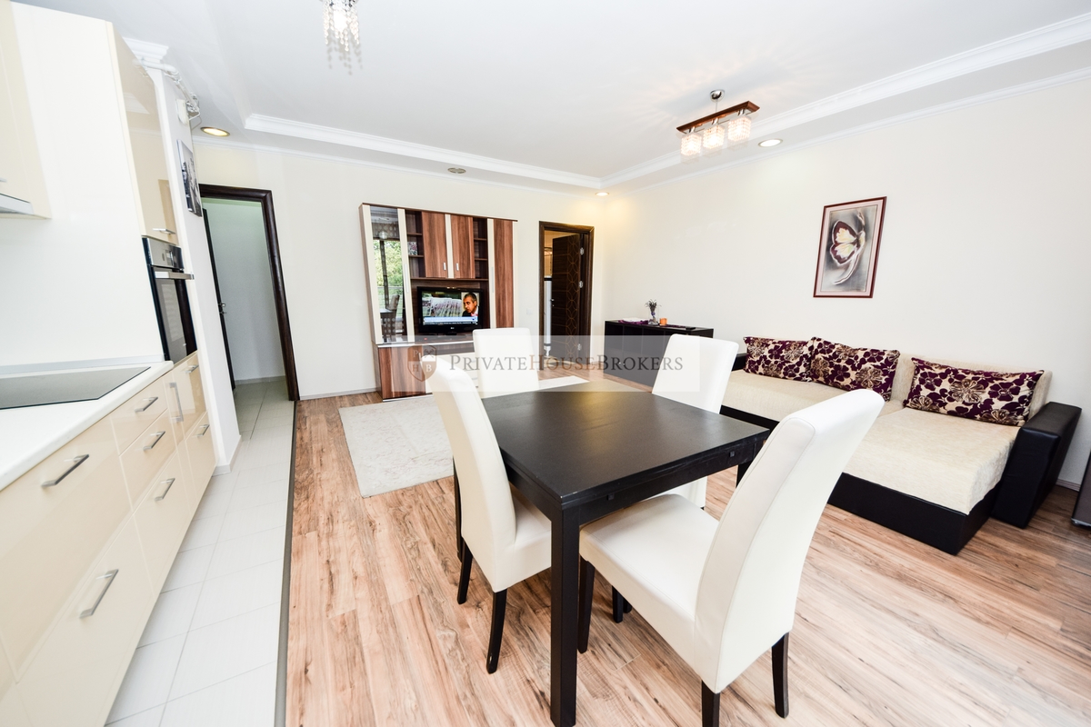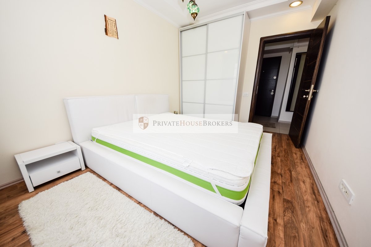 Apartamentul este situat la etajul 2 din 7, living si dormitor matrimonial, baie cu cada, terasa mare, este semidecomandat si are o suprafata de 55 mp interior + 9 mp terasa. Apartamentul este mobilat si utilat complet modern, dispune de centrala proprie de apartament, aer conditionat, televizor, paza 24/24. Acces gratiut la piscina si sauna.