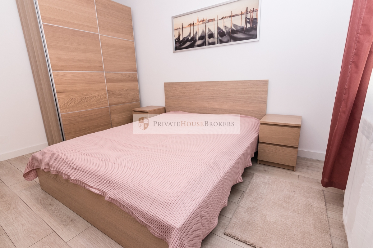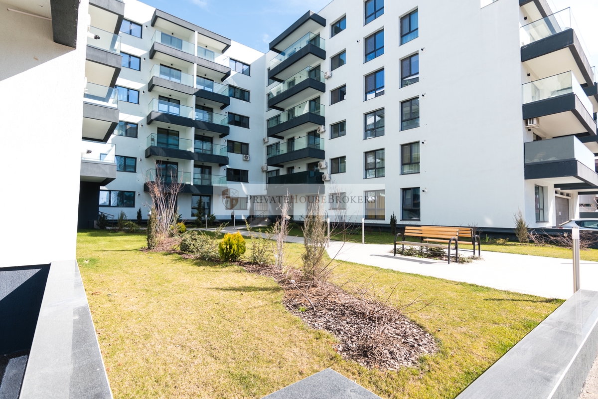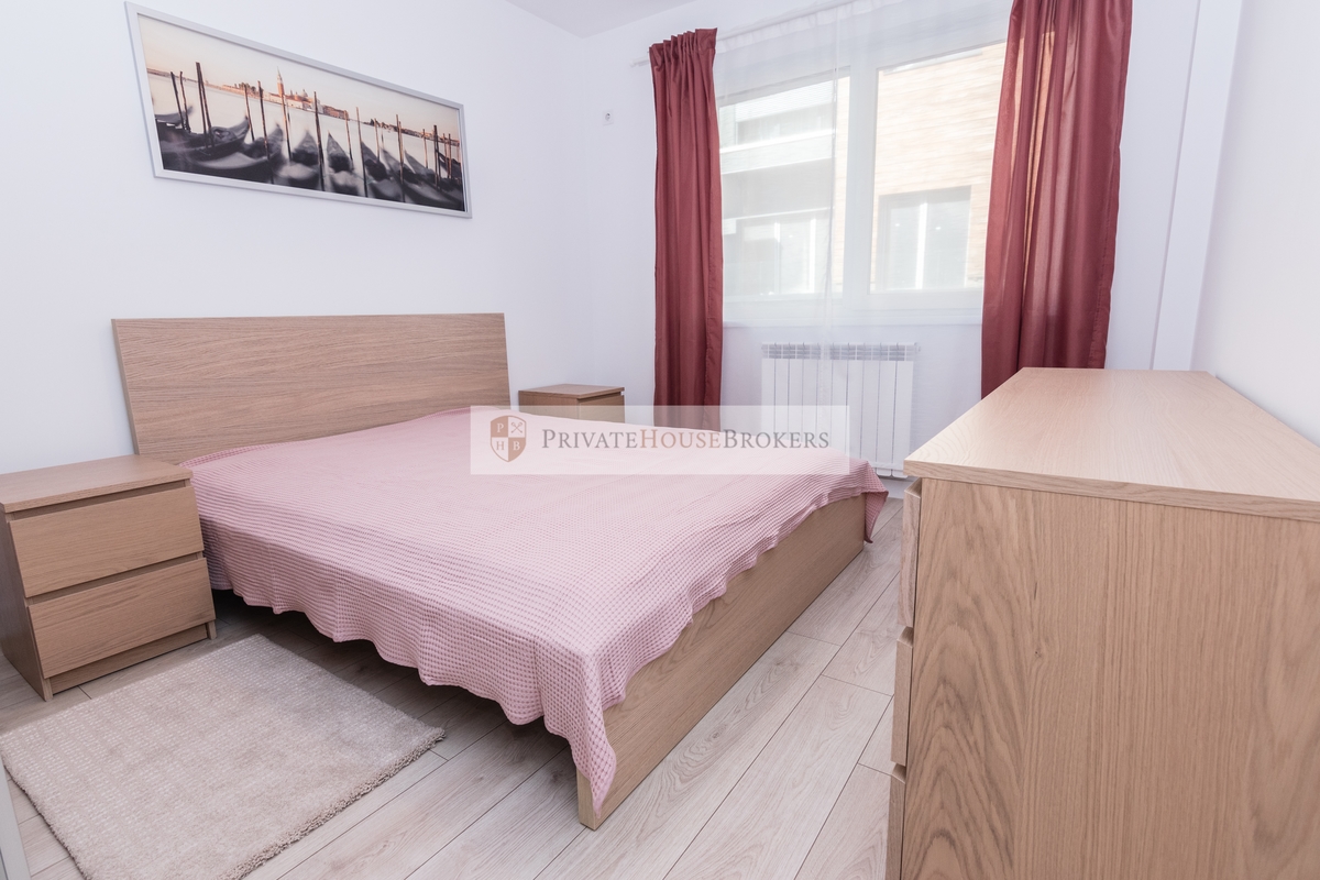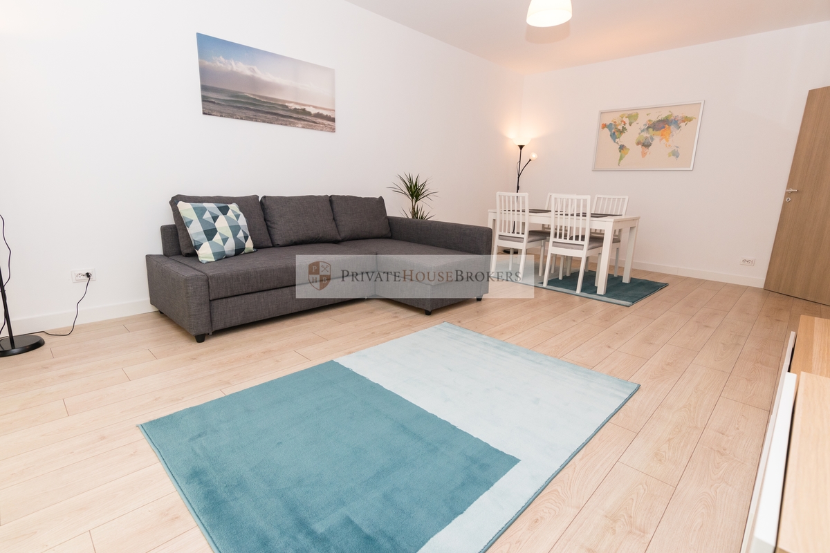 Apartamentul este situat la etajul 3 din 5, are 2 camere, living si dormitor matrimonial, baie cu cada, este decomandat si are o suprafata de 60 mp utili interior + 10 mp terasa. Apartamentul este mobilat si utilat complet modern, totul este nou la prima inchiriere, dispune de centrala proprie de apartament, aer conditionat, televizor, masina de spalat vase si rufe. In pret este inclus si contractul inregistrat la Administratia Financiara.