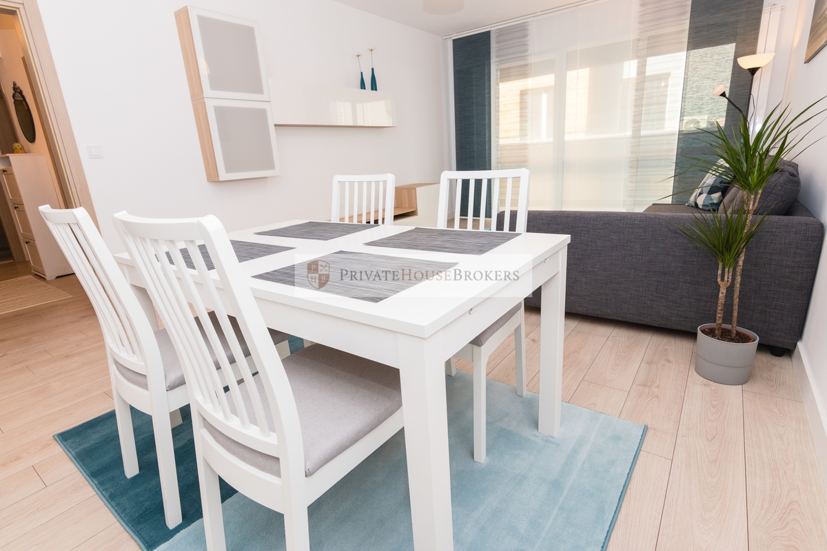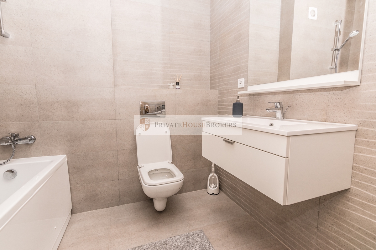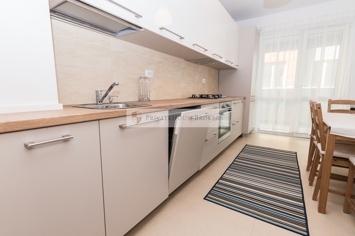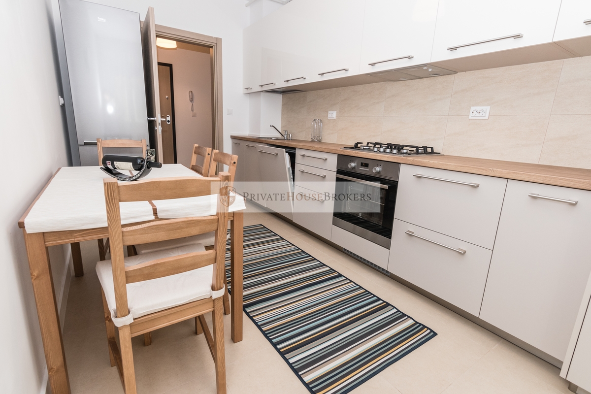 Apartamentul este situat la etajul 3 din 5, are 2 camere, living si dormitor matrimonial, baie cu cada, este decomandat si are o suprafata de 60 mp utili interior + 10 mp terasa. Apartamentul este mobilat si utilat complet modern, totul este nou la prima inchiriere, dispune de centrala proprie de apartament, aer conditionat, televizor, masina de spalat vase si rufe. In pret este inclus si contractul inregistrat la Administratia Financiara.