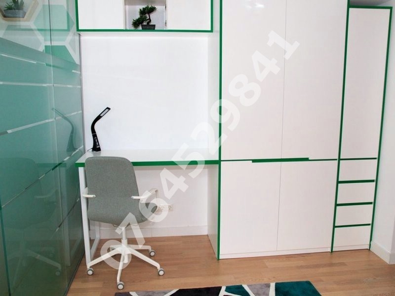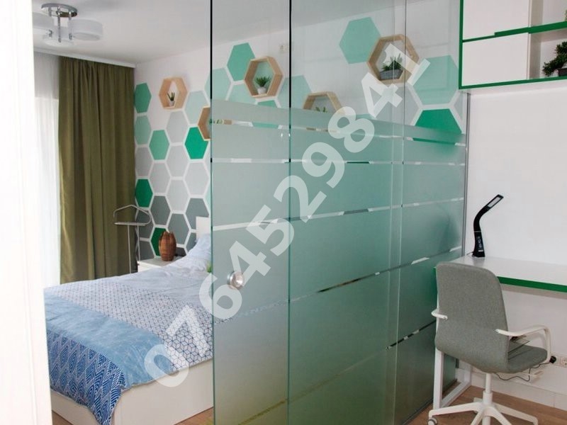 Dormitorul a fost impartit in 2 zone:zona de dormit si zona de birou separte intre ele printr-un perte de sticla.