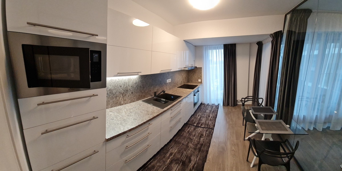 Bucataria este complet utilata si mobilata. Apartamentul are masina de spalat vase, cuptor electric cu autocuratare pirolitica, plita inductie si hota cu functia Hob2Hood care conecteaza plita si hota printr-o conexiune wireless, cuptor cu microunde, toate marca Electrolux. Totodata in bucatarie este un frigider No Frost Samsung.