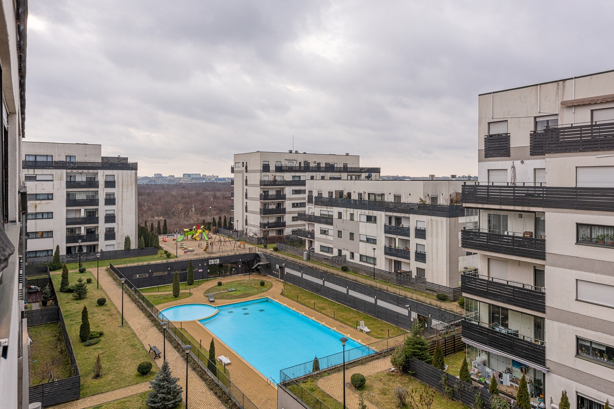 Baneasa, Aleea Privighetorilor, in the area of Baneasa Shopping City, for rent, a 2-bedroom apartment in Natura Residence residential compound, 100 sqm, 4th floor / GF+5, 2 bathrooms, terrace with great view to the pool.