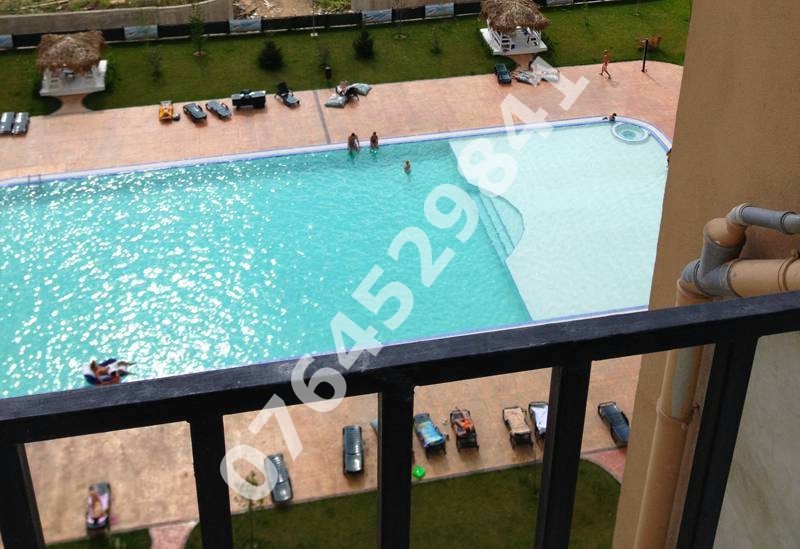 Apartamentul are vedere catre piscina.
