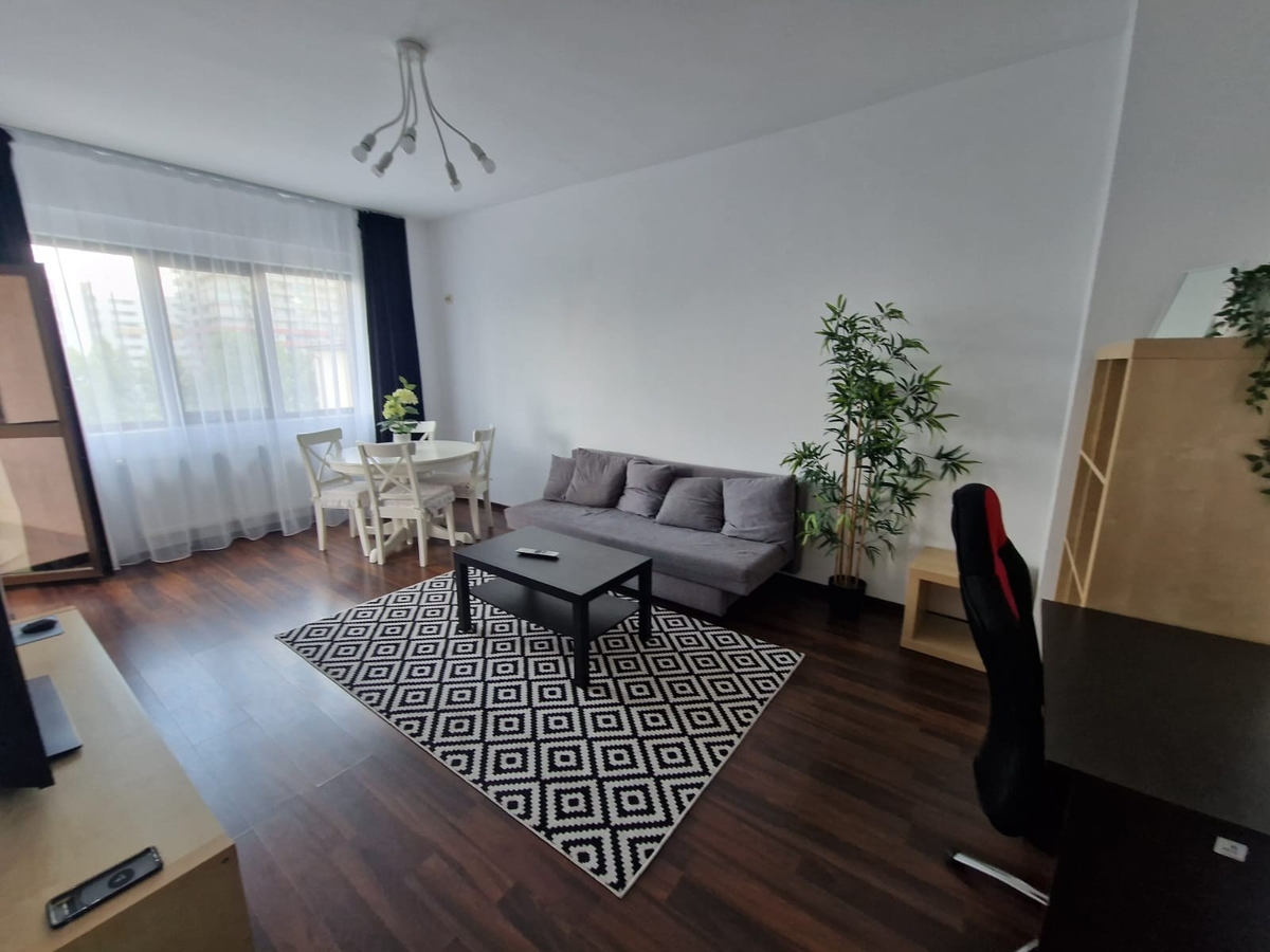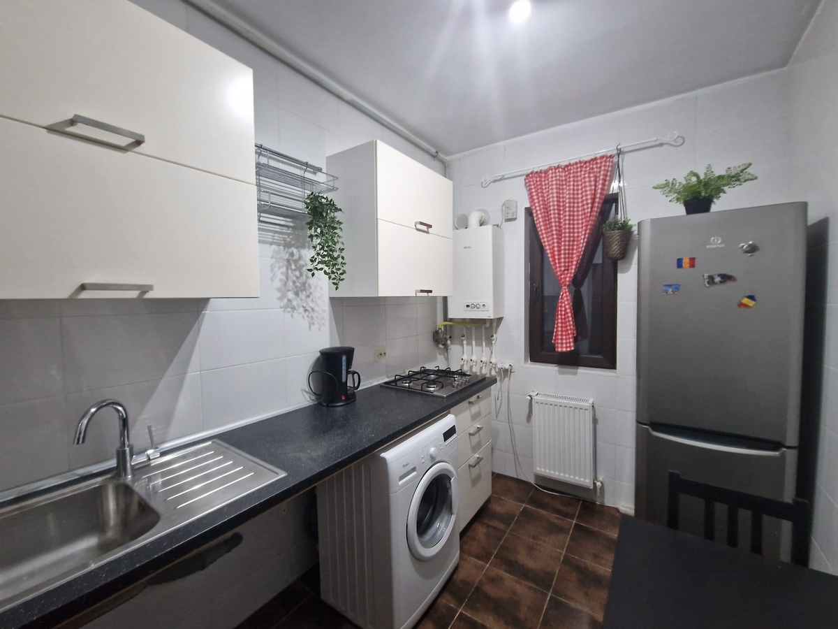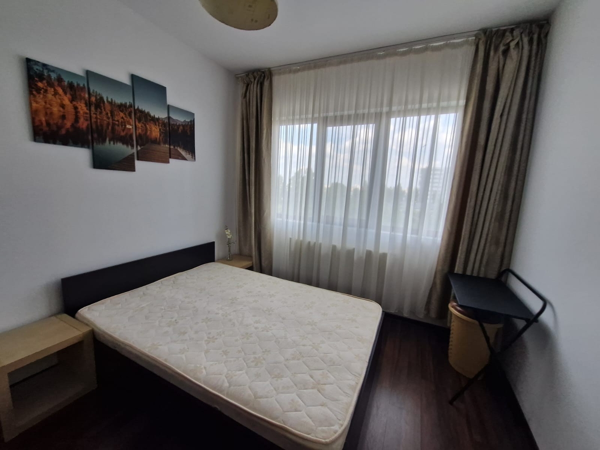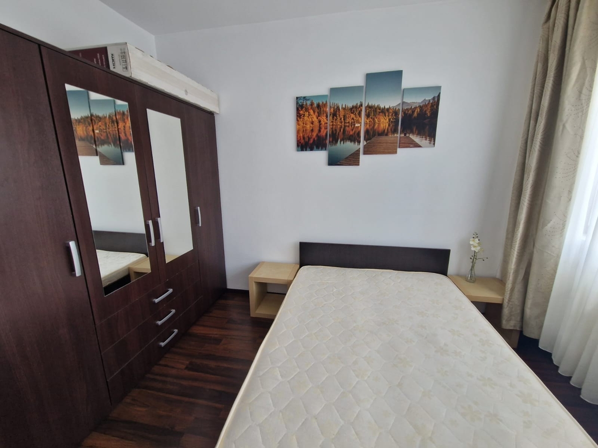 Apartamentul este mobilat si utilat, living spatios si luminos (tv, canapea extensibila), bucatarie mobilata si utilata (frigider, aragaz, cafetiera, centrala termica, masina de spalat), dormitor pat matrimonial, dormitor cu birou si canapea extensibila.