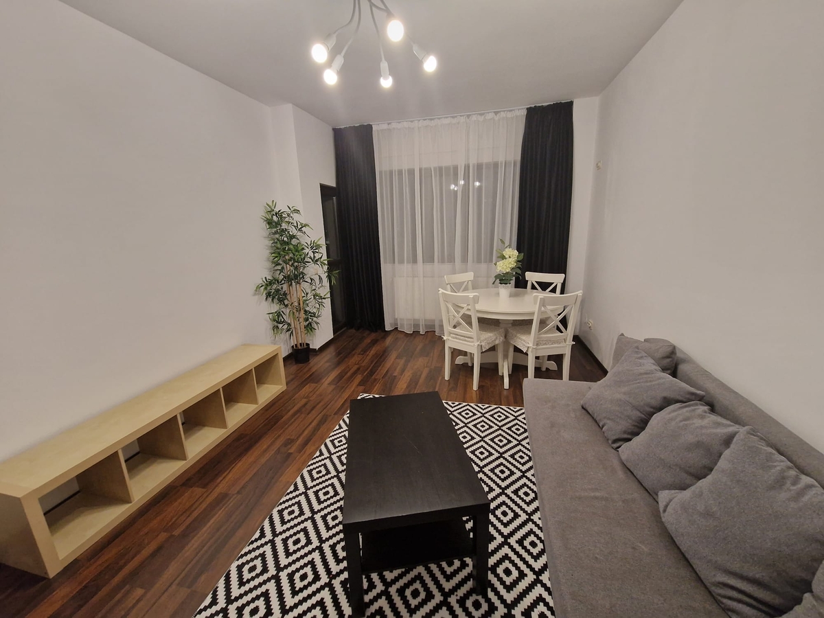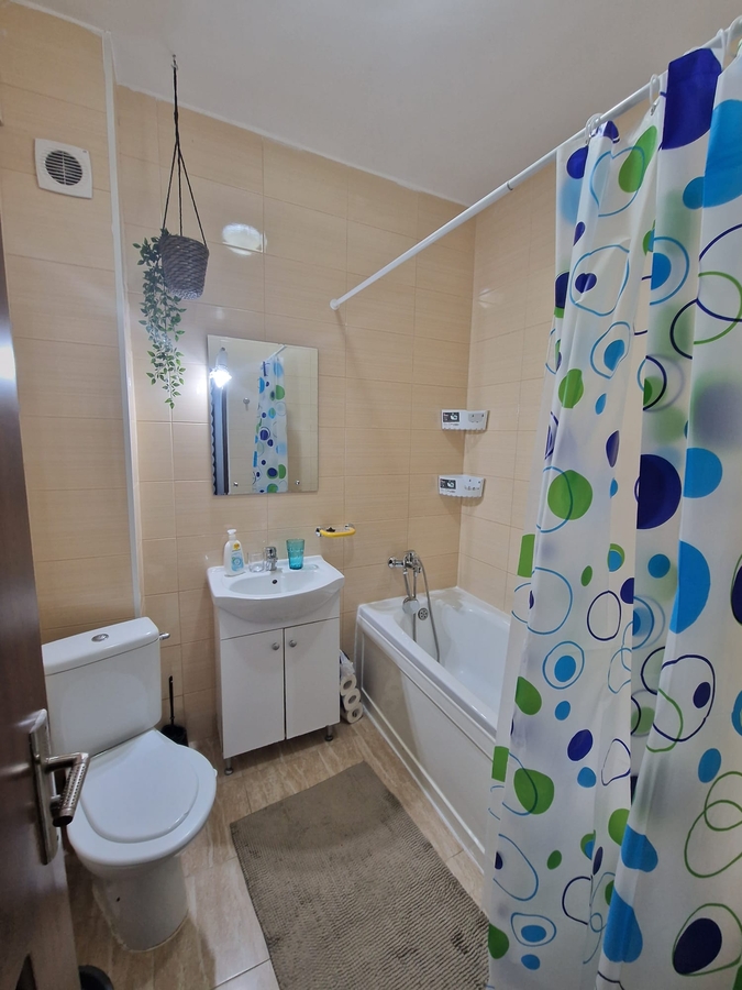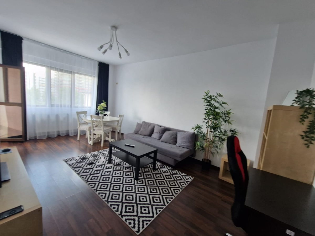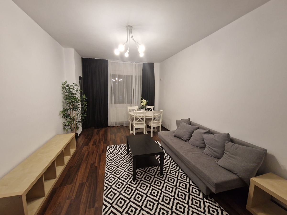 Apartamentul este mobilat si utilat, living spatios si luminos (tv, canapea extensibila), bucatarie mobilata si utilata (frigider, aragaz, cafetiera, centrala termica, masina de spalat), dormitor pat matrimonial, dormitor cu birou si canapea extensibila.