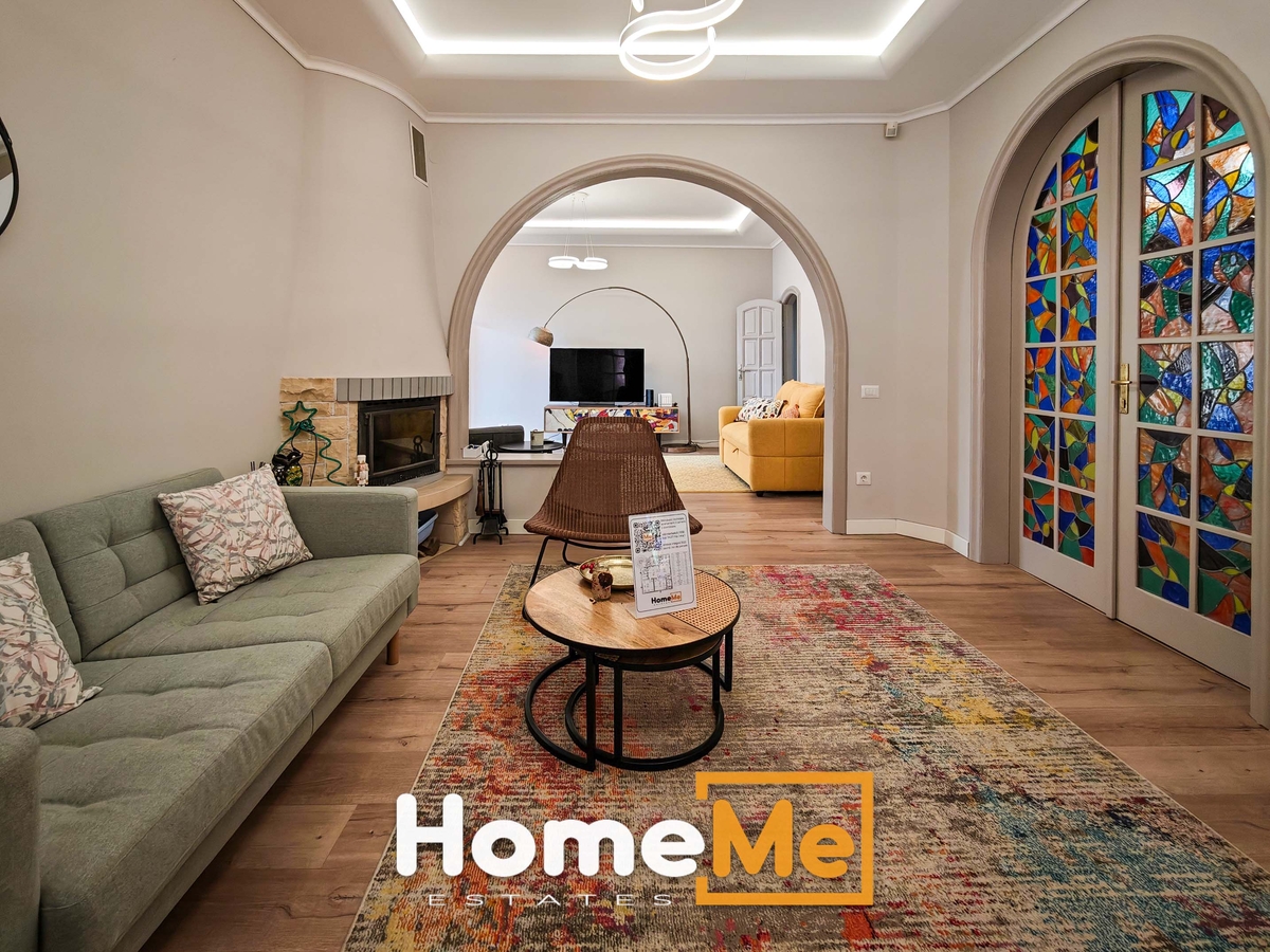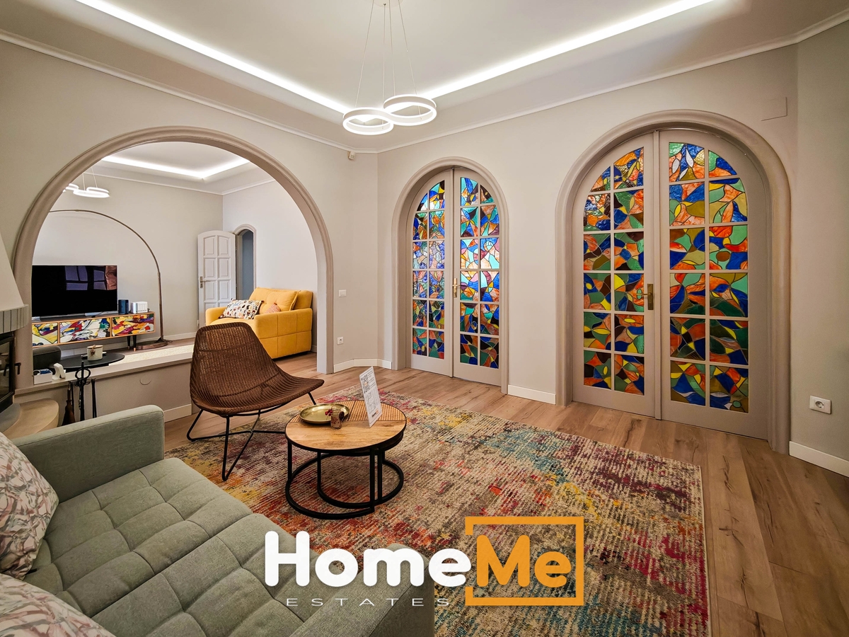 Interiorul apartamentului a fost renovat integral in anul 2023. Spatiul a fost modernizat fara a-i sterge identitatea istorica. Suprafata utila a locuintei este de 94,57 metri patrati. Livingul este piesa centrala, avand o suprafata generoasa de aproape 40 metri patrati. Arcadele rotunde de la exterior se regasesc armonios si in structura camerelor. Un element deosebit este reprezentat de usile duble cu vitralii abstracte. Designul acestora este modern, amintind de stilul cubist sau de arta abstracta.