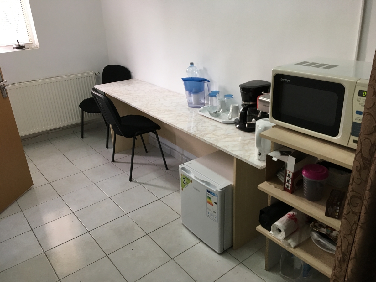 - mini bucatatie (cuptor cu microunde, expresor, filtru de cafea, frigider, cana electrica, etc.) si vestiar;