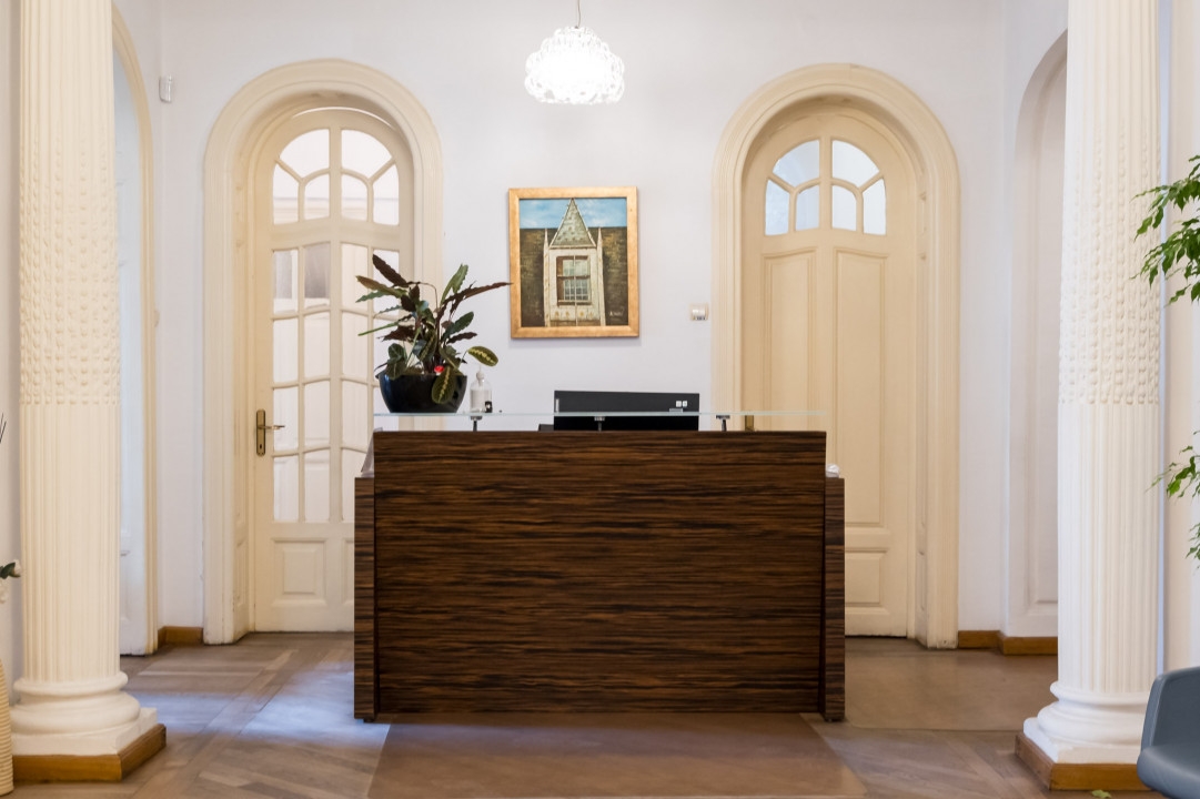 Parterul este maiestuos, cu o intrare monumentala catre un salon de primire, camerele pentru intalniri fiind dispuse radial acestuia, fiind despartite de usi mari de tip glasswand, cu geamuri din cristal fatetat. Pe un culoar ce desparte zona de primire se realizeaza accesul catre zona administrativa a parterului, cu birouri si zona de relaxare pentru angajati, 3 grupuri sanitare, bucatarie si loc de luat masa.