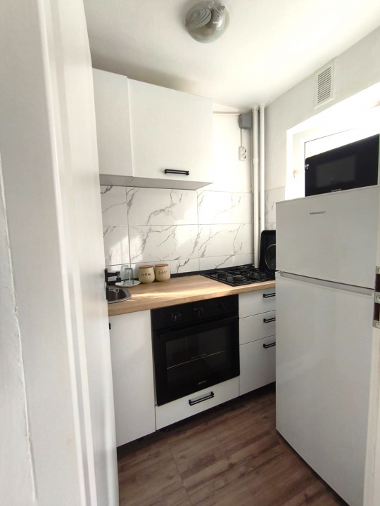 Bucatarie complet utilata: frigider, plita pe gaz, cuptor, cuptor cu microunde, mobilier modern + blat generos