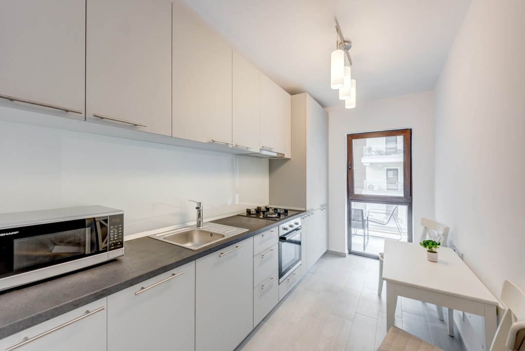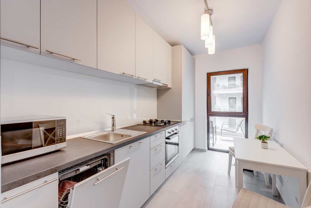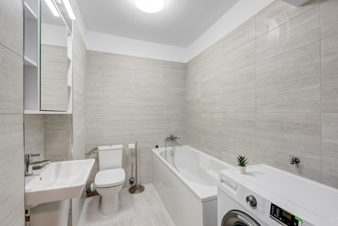 Bucataria este complet mobilata si utilata cu toate electricasnicele necesare: plita, cuptor, hota, masina de spalat vase, frigider, cuptor cu microunde. Baia este complet echipata cu obiecte sanitare, dotata cu cada si masina de spalat rufe.