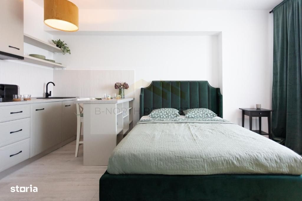 B-North Real Estate va propune spre inchiriere o garsoniera moderna, complet mobilata si utilata, situata intr-o cladire recent renovata, fost hotel, amenajata intr-un stil elegant si functional, ideal pentru un stil de viata urban confortabil.