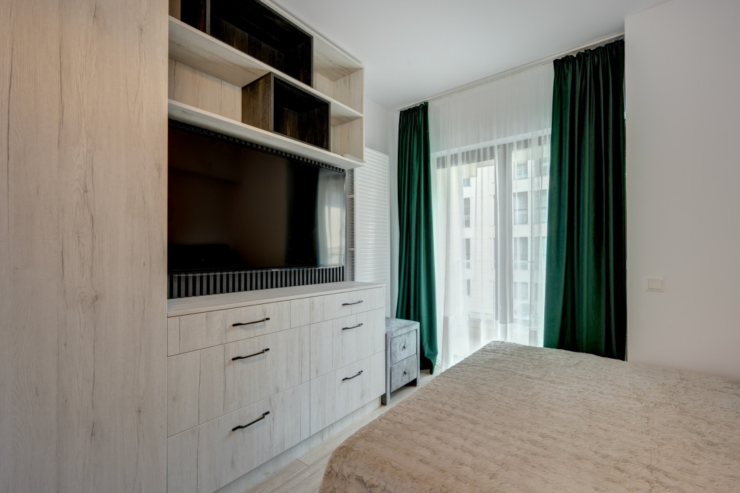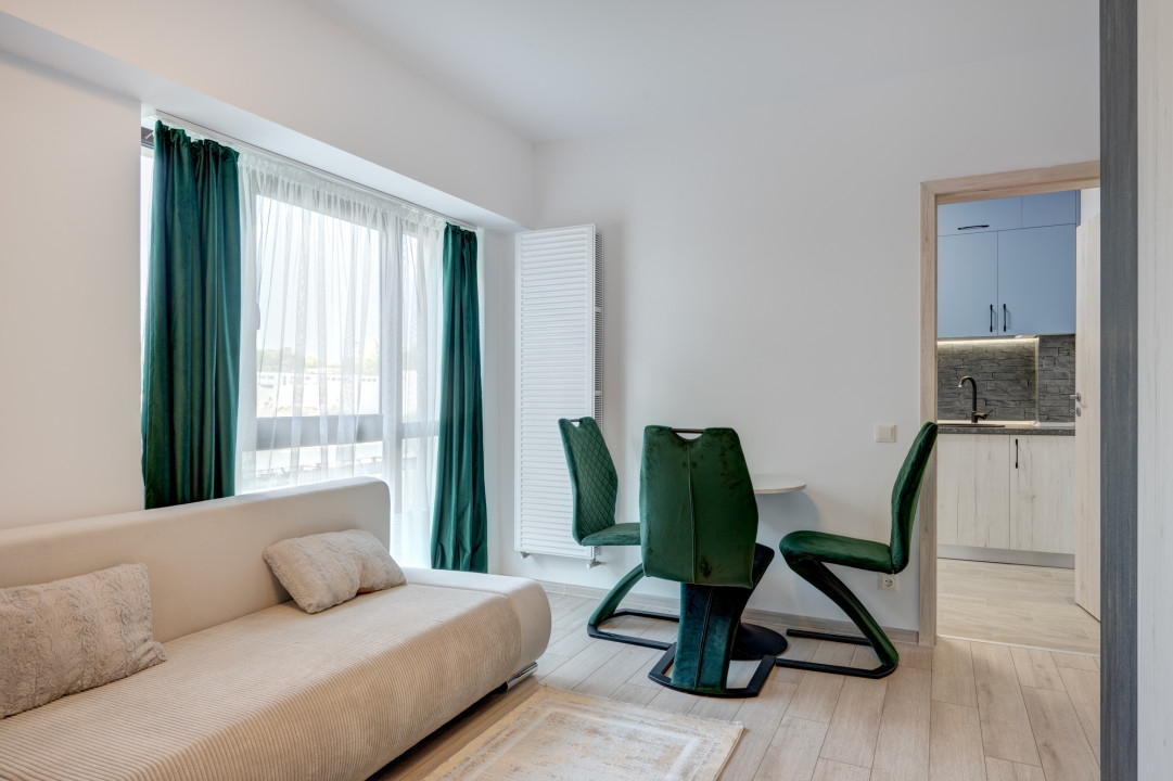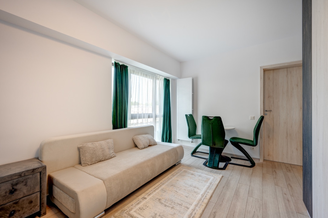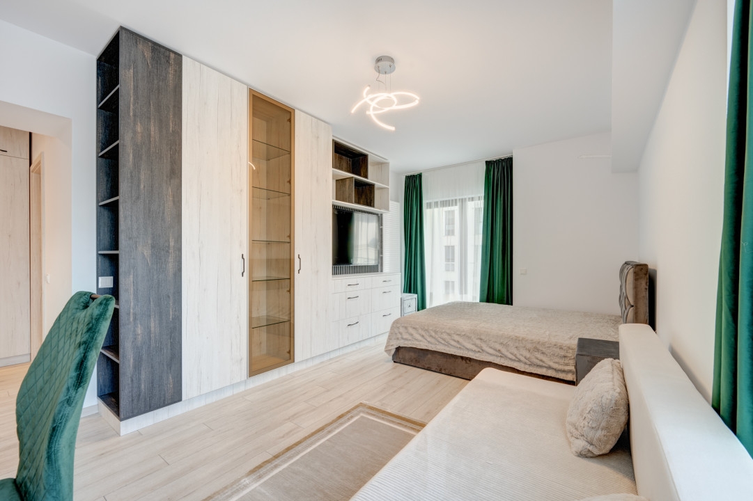 Garsoniera este situata la etajul 1/10 intr-un imobil predat in folosinta in anul 2023. Garsoniera este spatioasa, are o suprafata de 39 mp si beneficiaza de o terasa cu acces din living. Garsoniera este complet mobilata si utilata si este la la a doua inchiriere. Este amenajata modern si beneficiaza de multe spatii pentru depozitare. Holul de la intrare este amenajat cu un dressing spatios, livingul are de asemenea mobilier cu spatii pentru depozitare, un pat matrimonial si o canapea extensibila, zona de luat masa, TV. Este instalat deja un aparta de aer conditionat.