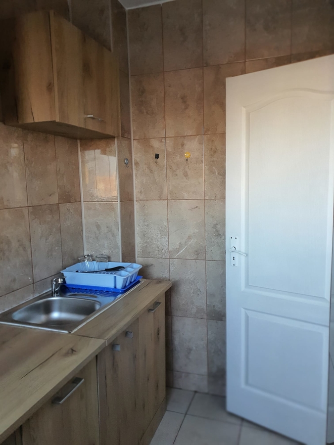 Bucatarie: aragaz, mobila de bucatarie, chiuveta, geam pentru aerisire, apometre apa, usa lemn, gresie si faianta, calorifer fonta
