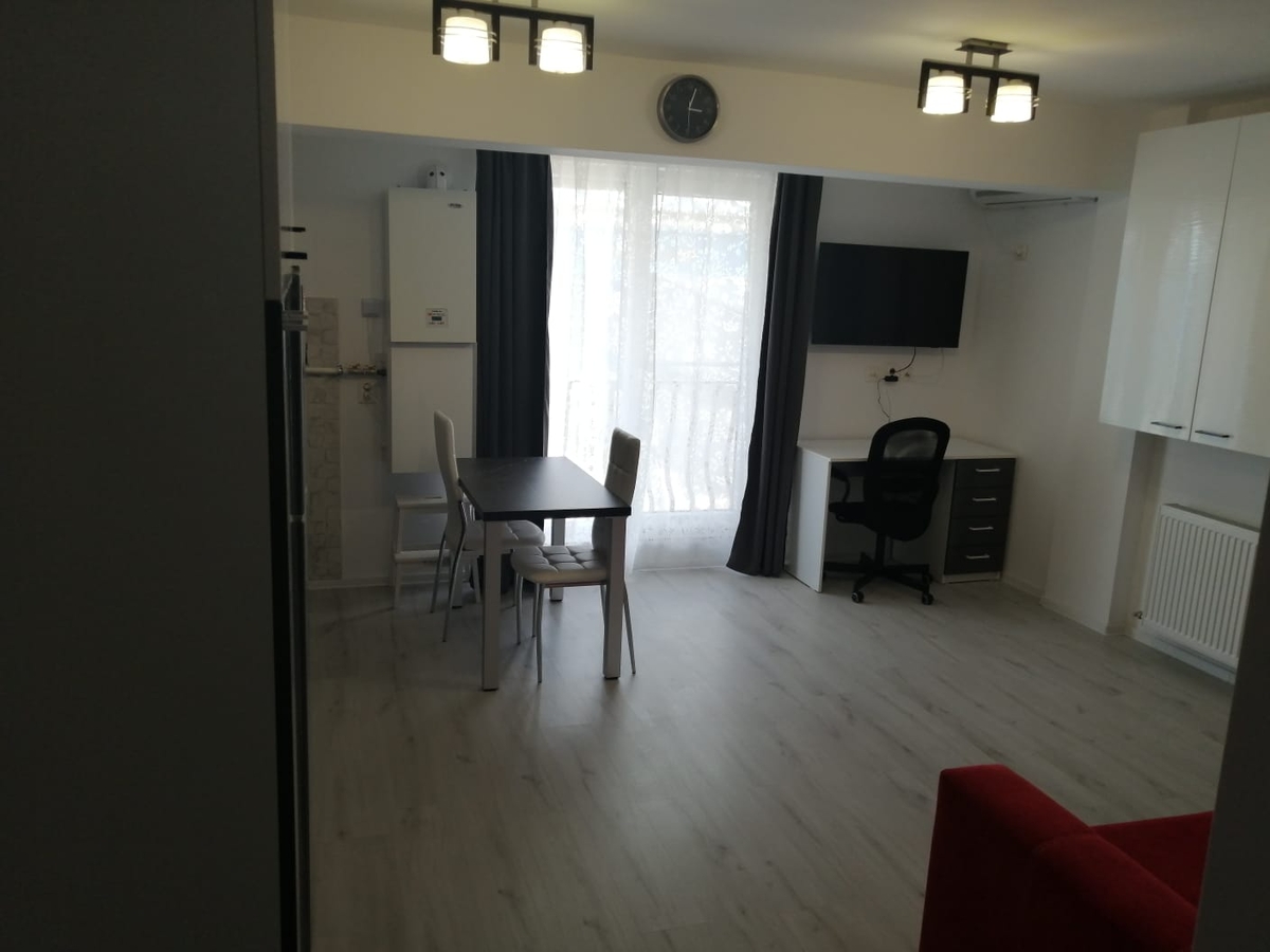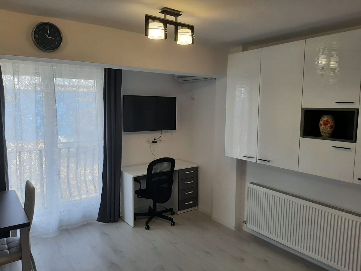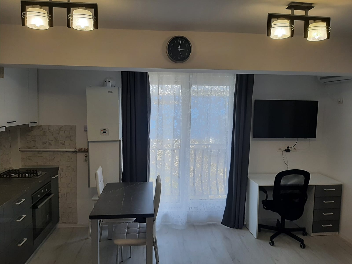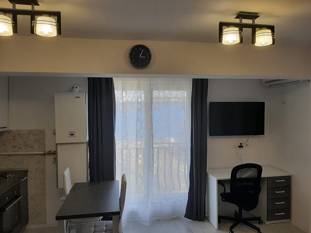 Garsoniera este dotata cu centrala termica, canapea extensibila de marimea unui pat normal, smart TV 80cm, cuptor si aragaz pe gaz.