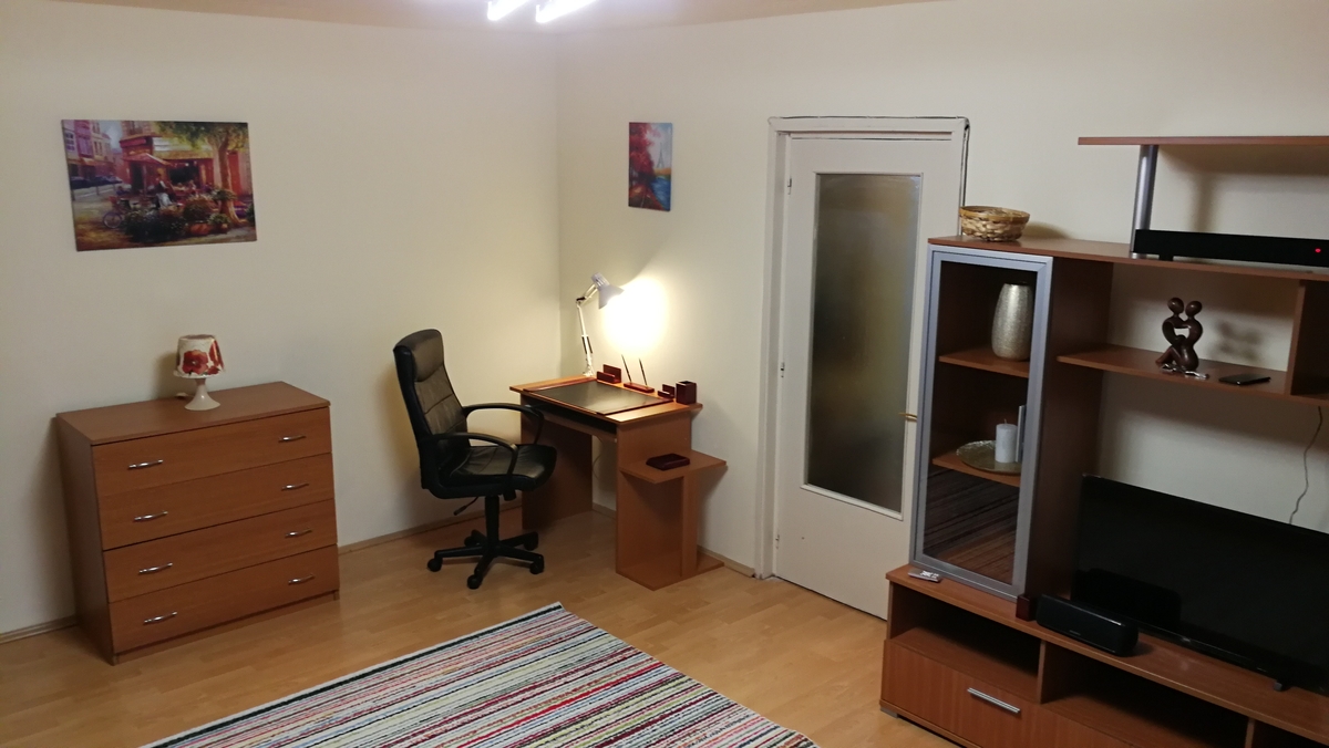 CAMERA: aer conditionat, TV LED + soundbar, aspirator, izolatie termica exterioara, biblioteca Mobexpert, canapea Elvila si topper nou sigilat, dormitor 2 sifoniere in 2 usi, corp tip soldat, comoda 4 sertare, birou lucru iluminat si scaun de birou, covor, corp iluminat LED nou, veioza;