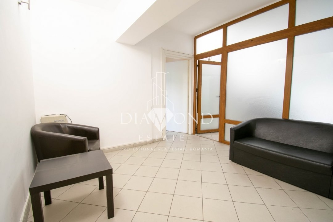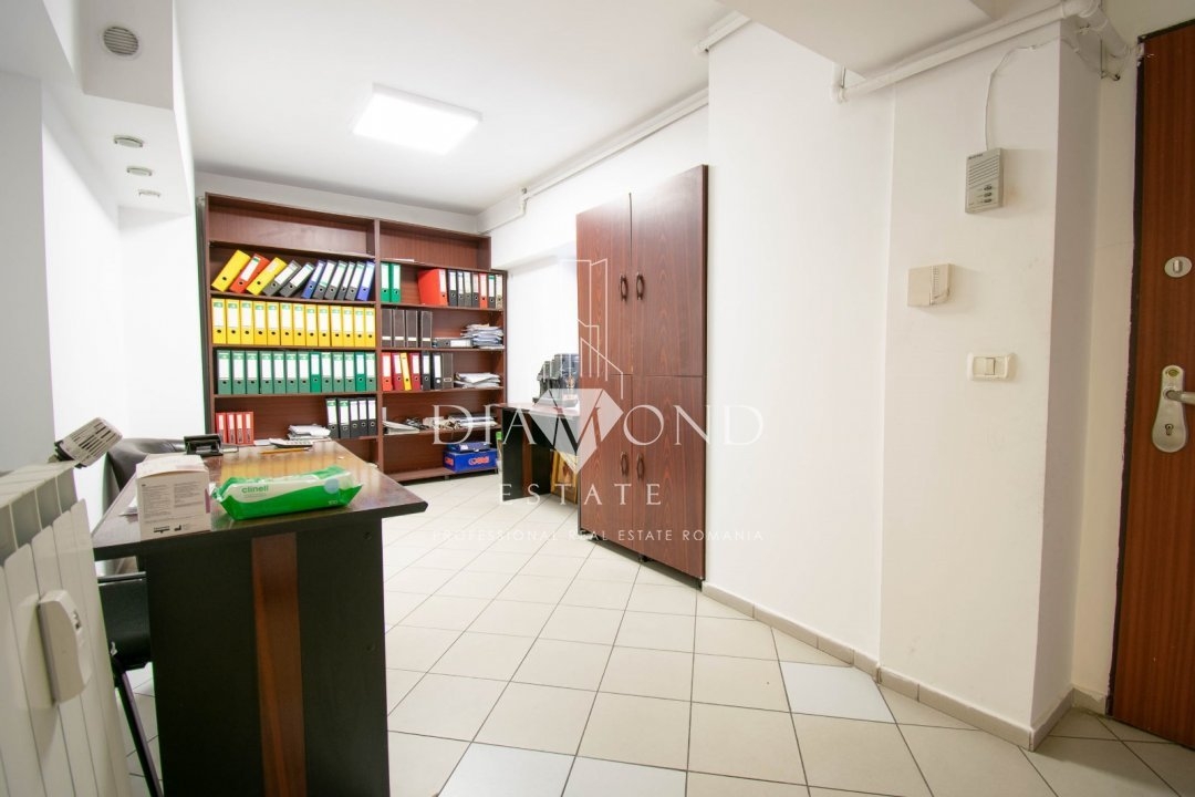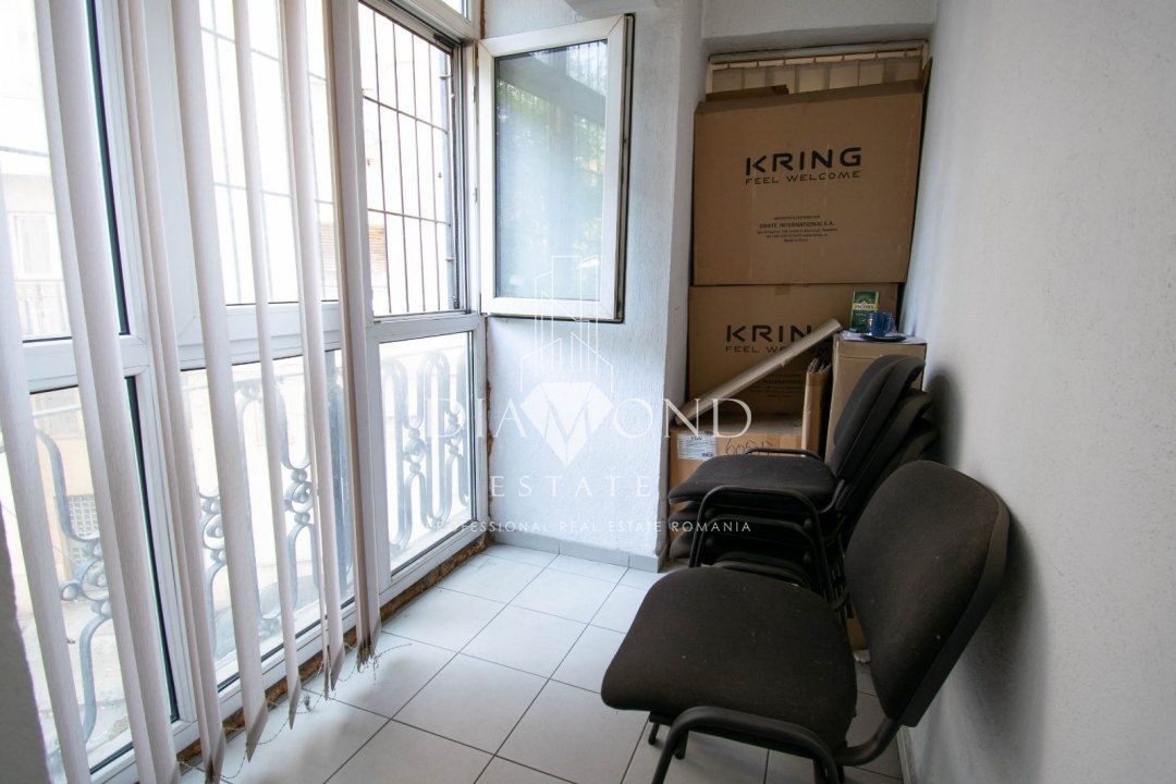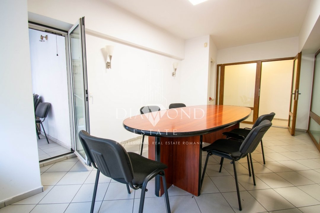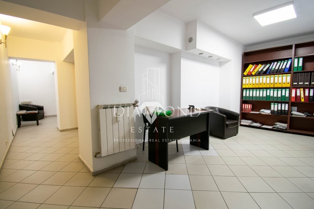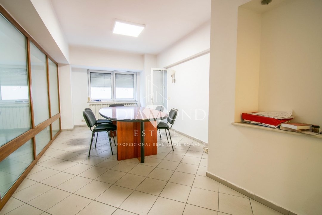 Situat ideal la etajul 1 al unui imobil construit in anii '90, apartamentul dispune de 4 camere, dintre care 3 camere sunt amenajate pentru birou si una este sala de sedinte, iar pe hol mai este amenajata o sala de asteptare, doua bai, trei balcoane(vezi schita) si o bucatarie ce poate fi folosita ca inca un birou sau o receptie, ce va fi cu siguranta atent exploatata de catre membrii echipei. Camerele sunt spatioase, utilate pentru activitate de birou.