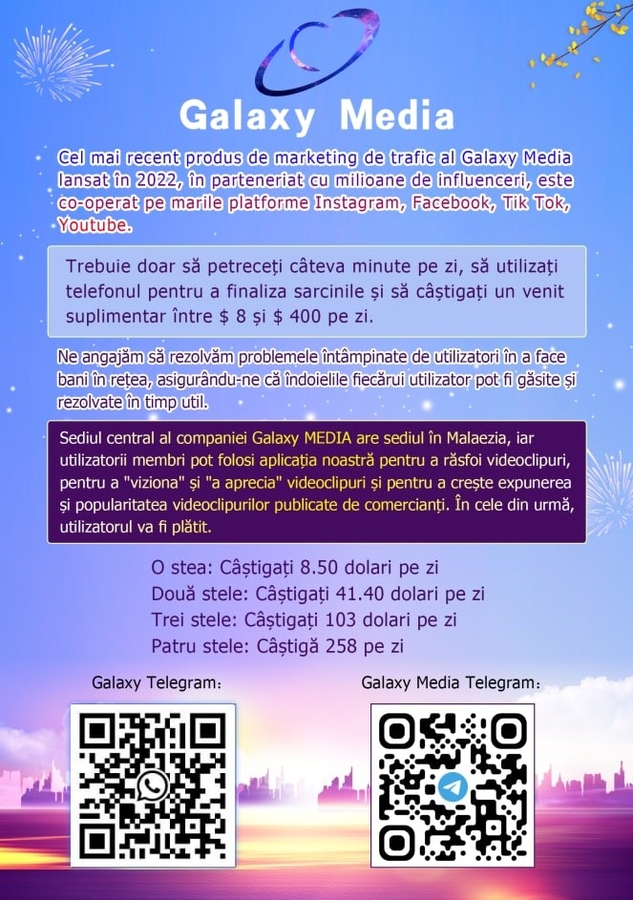 Compania Galaxy Media recruteaza acum angajati online La 1 stea - 12 sarcini pentru 0,71 USD. Cand obtineti 2 stele, aveti deja 28 de sarcini de munca la 1,48 USD. Pentru detalii adresativa la numarul Whatsap: