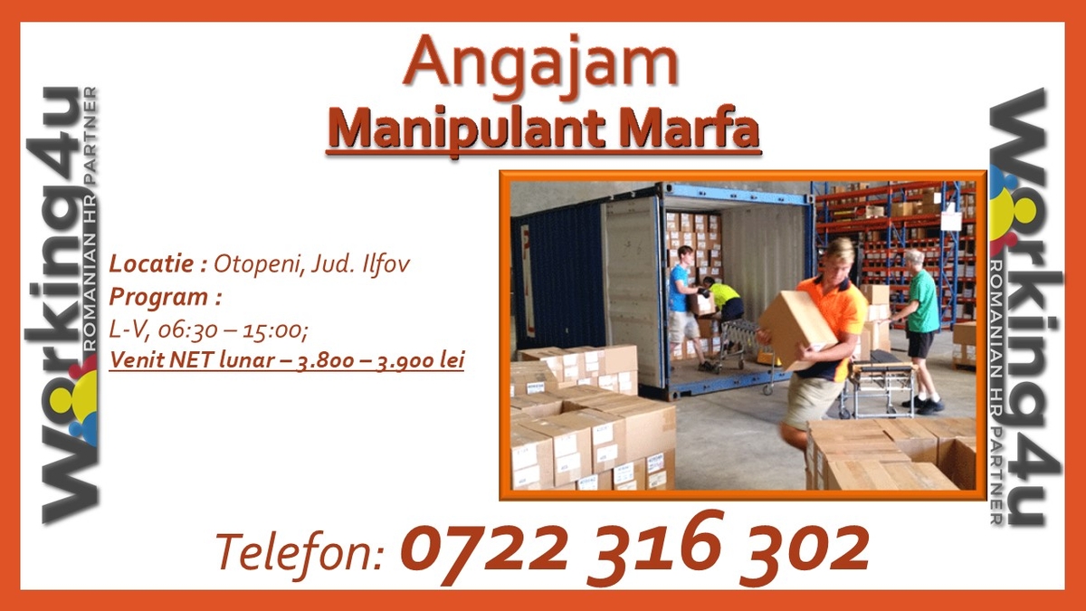 Pentru clientul nostru, casa de expeditii ce ofera servicii din intregul lant logistic, suntem in cautare de noi colegi pentru pozitia de manipulant marfa in cadrul echipei din Otopeni, jud. Ilfov.