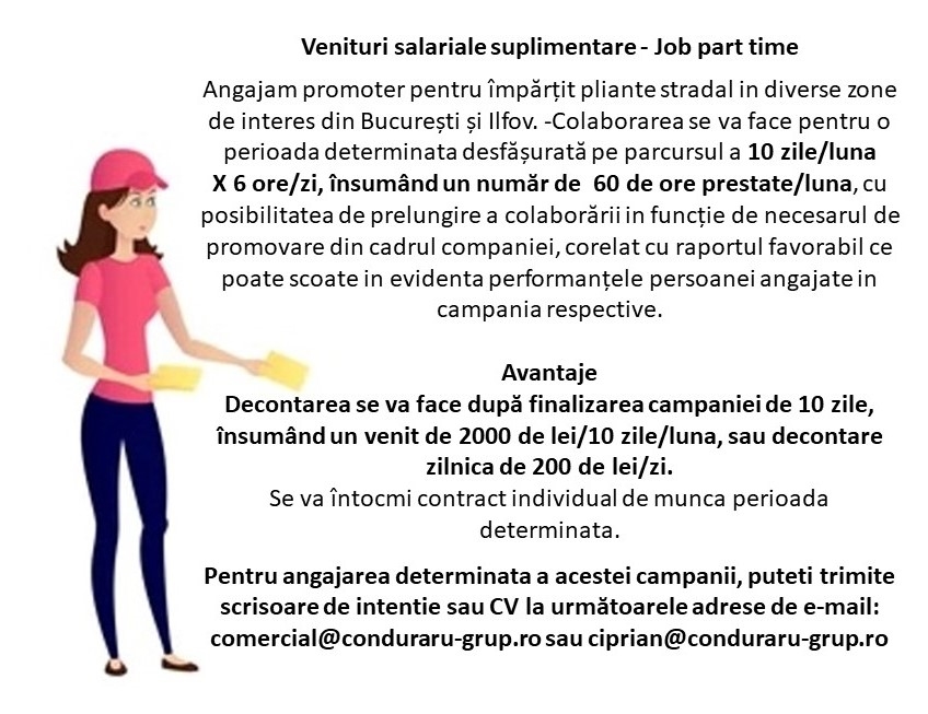 Venituri salariale suplimentare - Job part time Angajam promoter pentru impartit pliante stradal in diverse zone de interes din Bucuresti si Ilfov. -Colaborarea se va face pentru o perioada determinata desfasurata pe parcursul a 10 zile/luna X 6 ore/zi, insumand un numar de 60 de ore prestate/luna, cu posibilitatea de prelungire a colaborarii in functie de necesarul de promovare din cadrul companiei, corelat cu raportul favorabil ce poate scoate in evidenta performantele persoanei angajate in campania respectiva. Avantaje: